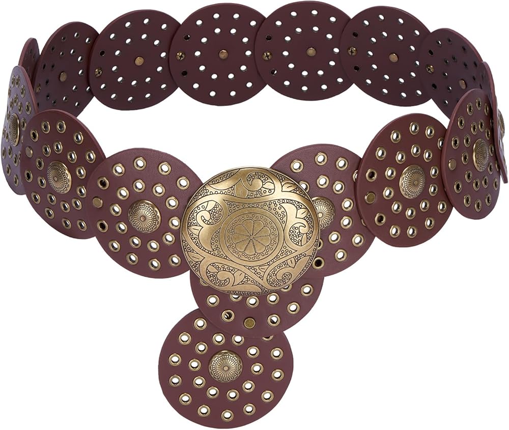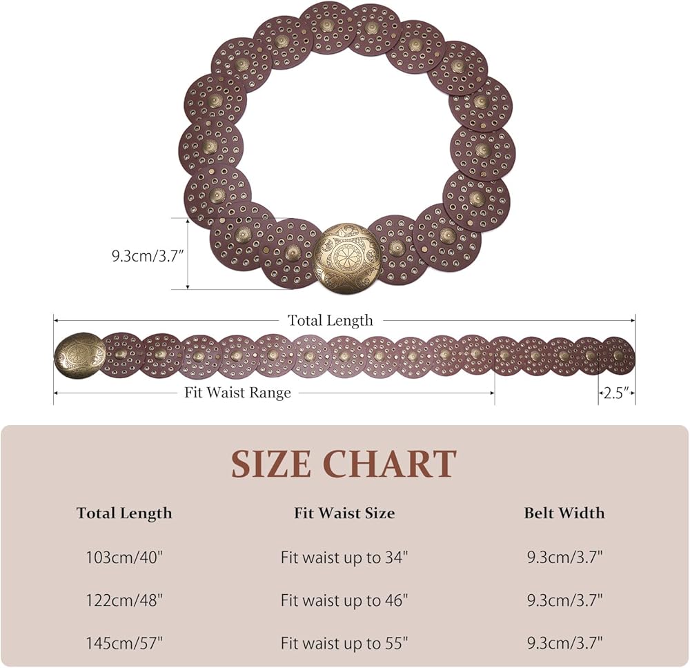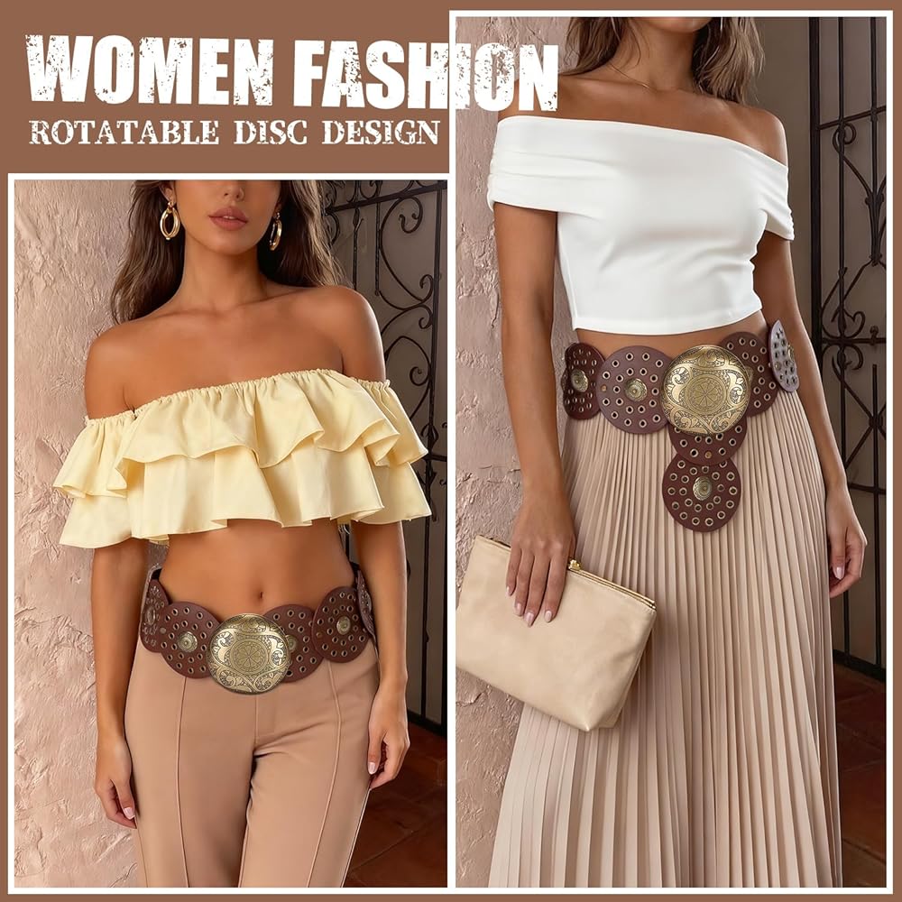 Unique Belt Design: This wide PU leather belt features a classic cowgirl/cowboy design with a big concho buckle and decorative disc, perfect for adding a touch of vintage western flair to any outfit.