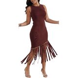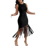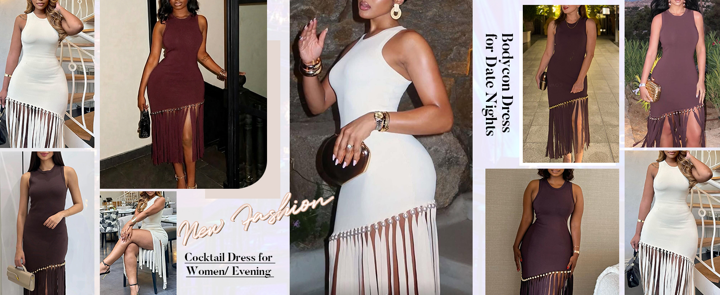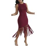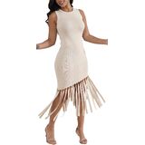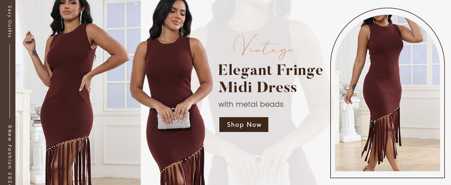 Features: This sexy dress features a classic crew neck, slim fit silhouette, and curve-hugging design to flatter your figure. The asymmetrical fringe hem with eye-catching metal bead embellishments adds movement and a chic statement, making this vintage dress for women both elegant and unique.