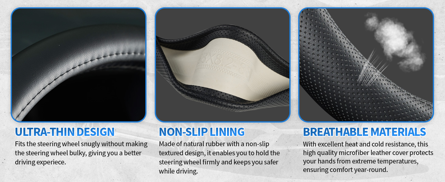 NON-SLIP & FULL PROTECTION: Made with a soft microfiber leather exterior and an anti-skid rubber lining, this cover ensures a secure grip for better control. It also protects your steering wheel from sun damage, scratches, fading, wear, and dirt, keeping it looking new for longer