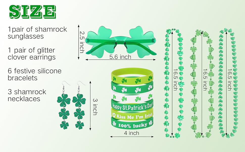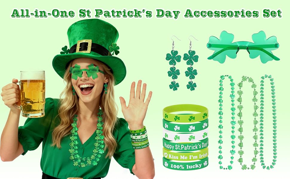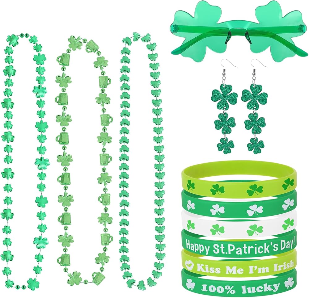 Complete St. Patrick's Day Costume Accessories Kit — This all-in-one set includes 6 shamrock silicone bracelets, 1 pair of glitter green clover drop earrings, 1 pair of shamrock-shaped sunglasses, and 3 different styles of green beaded necklaces. Everything you need to create a stylish and festive St. Patrick's Day look for parades, parties, and holiday celebrations.