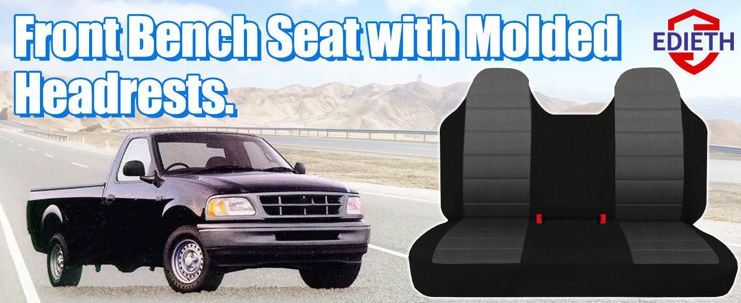 Precise Vehicle: These seat covers are made to correspond with the specifications for Ford F-150, F-250, and F-350 pickup trucks 1992 1993 1994 1995 1996 1997 1998. They are intended for the front, full-width bench seat configuration that does not include a center armrest. The design incorporates molded headrest covers and integrated side pockets for storage, aiming to provide a tailored appearance and functional fit for these specific truck models and seating setups.
