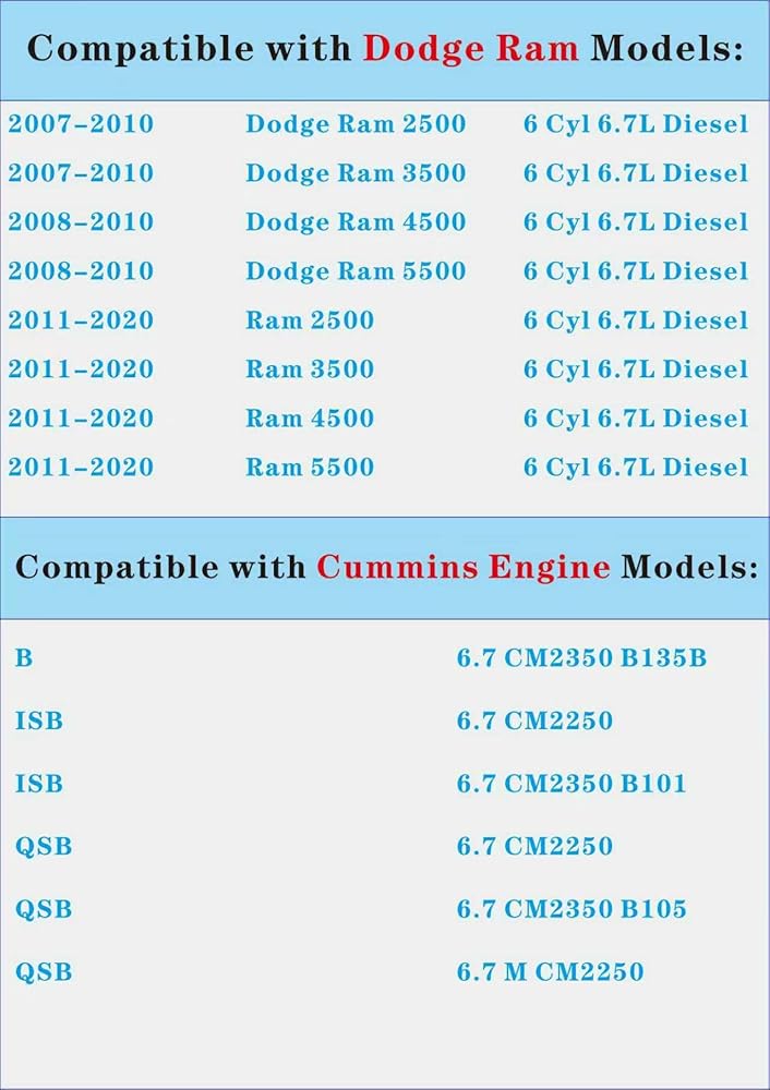 • FITMENT:Compatible with Ram 6.7L Cummins 2007.5-2025 2500,3500,4500,5500,2011 to 2020 Ford F550,F650,2008 to 2017 Freightliner MB Line MC Line XC 6.7L ISB engine