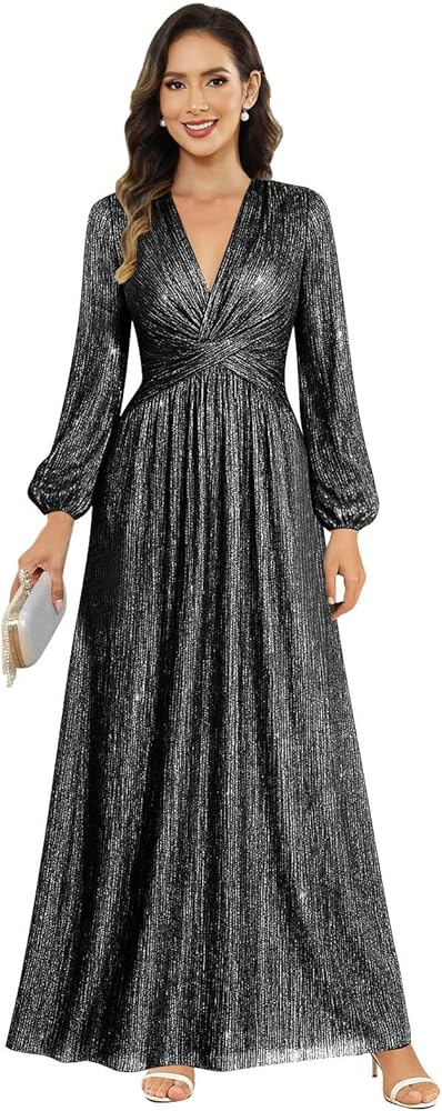 Feature:Long Sleeve Mother of the Bride Dresses, Sequin Formal Evening Gowns, Glitter Ruched Mother of the Groom Dresses, V Neck Bridesmaid Dress for Women, A Line Wedding Guest Dress, Sparkly Cocktail Party Dress