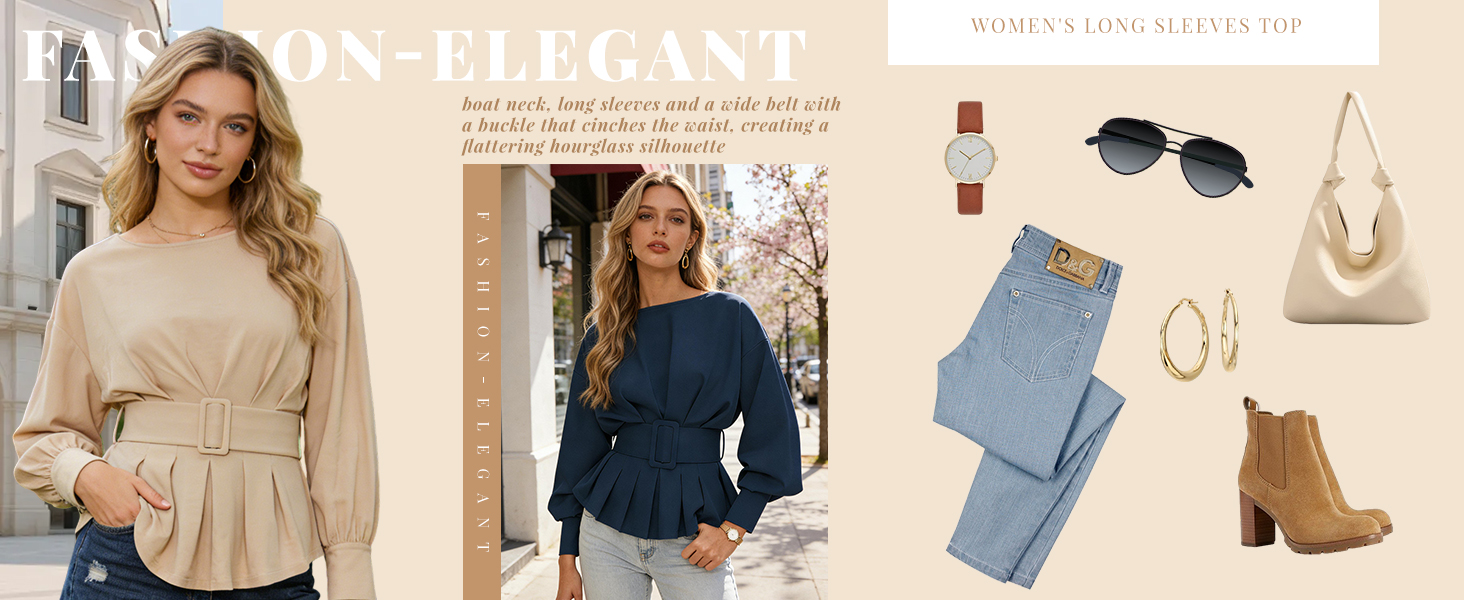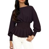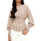 Feature: These pleated shirt deigns boat neck, balloon long sleeves for a trendy, dramatic look, and a wide belt with a statement buckle that cinches the waist, creating a flattering hourglass silhouette, the peplum hem and button cuffs adds elegant fashionable flow style