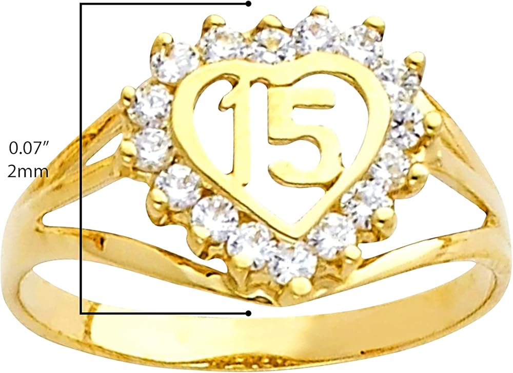 She'll love this dainty ‘15' heart ring, crafted from 14 karat yellow gold and cubic zirconia. The tri split shank ring showcases the number 15. An open central heart, framed with prong set white CZ gems, beautifully highlights the polished digits. This ring is perfect for celebrating a young lady's coming of age at her 15th birthday party or quinceañera. It also makes a great gift for anyone who was born on the fifteenth of the month, or who considers fifteen their lucky number. The ring is available in quarter sizes from 4 to 13, allowing you to choose the perfect fit. Treat yourself, or present this ring to a loved one in honor of a special occasion.