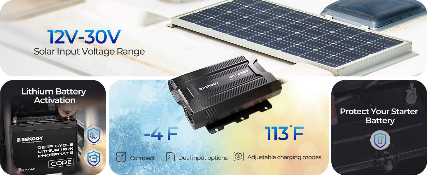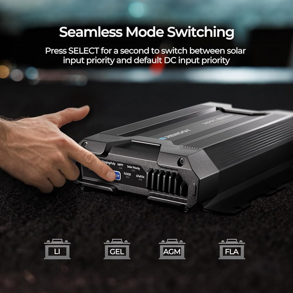 40A DC-DC Charger with MPPT & Solar Charger: This 𝐑𝐄𝐍𝐎𝐆𝐘 multi-battery charger delivers 𝐜𝐨𝐦𝐩𝐫𝐞𝐡𝐞𝐧𝐬𝐢𝐯𝐞 𝐩𝐫𝐨𝐭𝐞𝐜𝐭𝐢𝐨𝐧 for solar, alternator, and battery systems. Safeguarding against reverse polarity, over/under-voltage, and over-temperature, the 12V DC to DC charger ensures reliable operation across all scenarios. Ideal for RVs, marine, and off-grid setups requiring robust solar charging and alternator integration