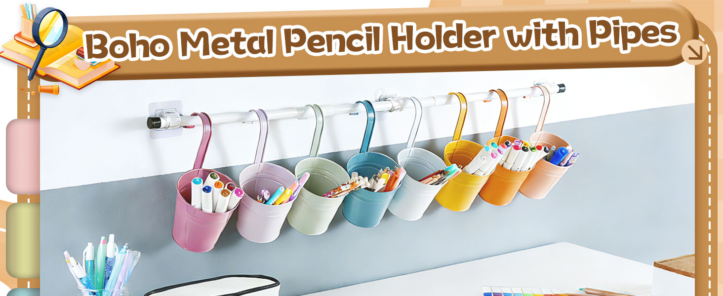 Boho Back-to-School Design: This first day of school pencil and crayon organizer set uses a bright Boho color scheme; 8 metal buckets match back-to-school liveliness. The Boho colorful look attracts kids to organize stationery, adding cheer to classroom desks, home study corners or craft spaces—turning messy storage into fun decor