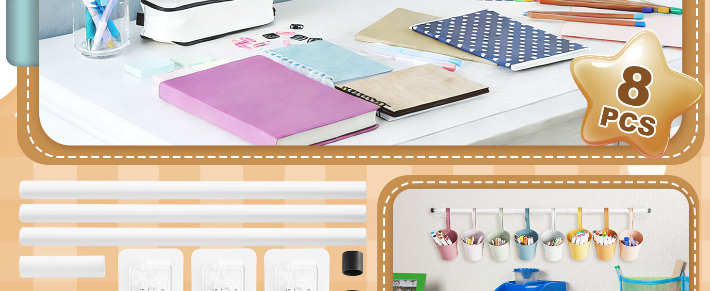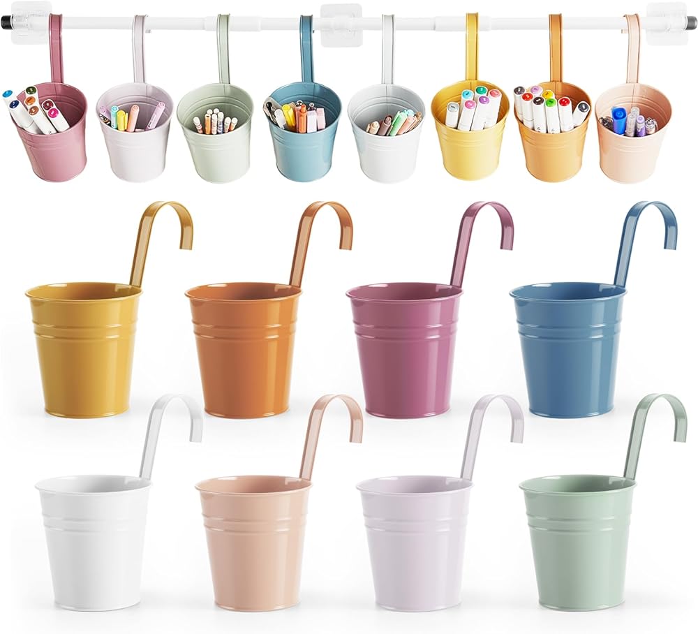 Package Includes: This back-to-school pencil and crayon organizer set has 8 Boho metal small buckets, 3 plastic pipes (30cm/11.8in each), 2 connectors, 2 plugs, and 3 transparent adhesive hooks. Each metal bucket is 3.9in tall (6.3in with hook), 3.15in bottom diameter, 3.9in top diameter—compact to keep stationery tidy and accessible