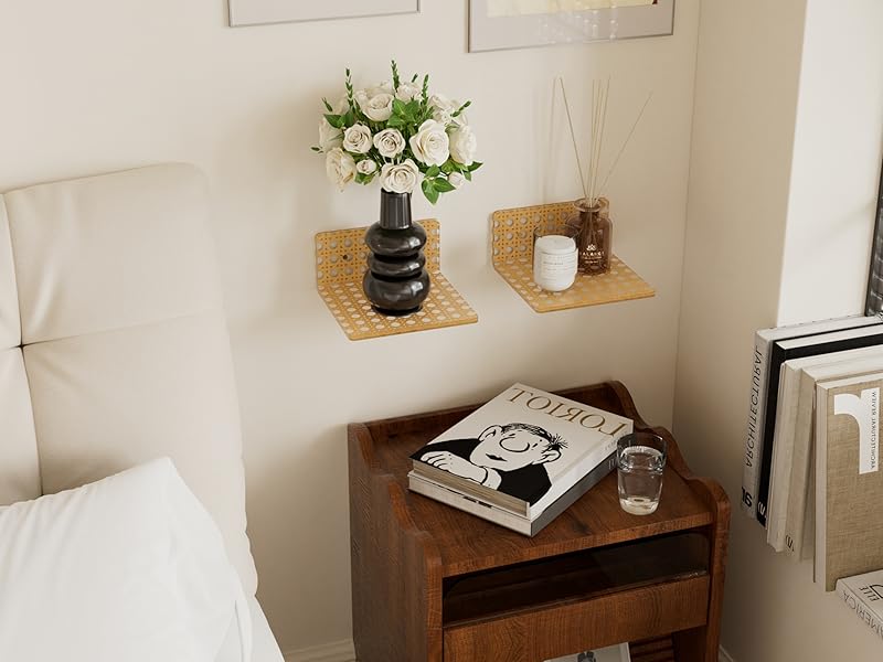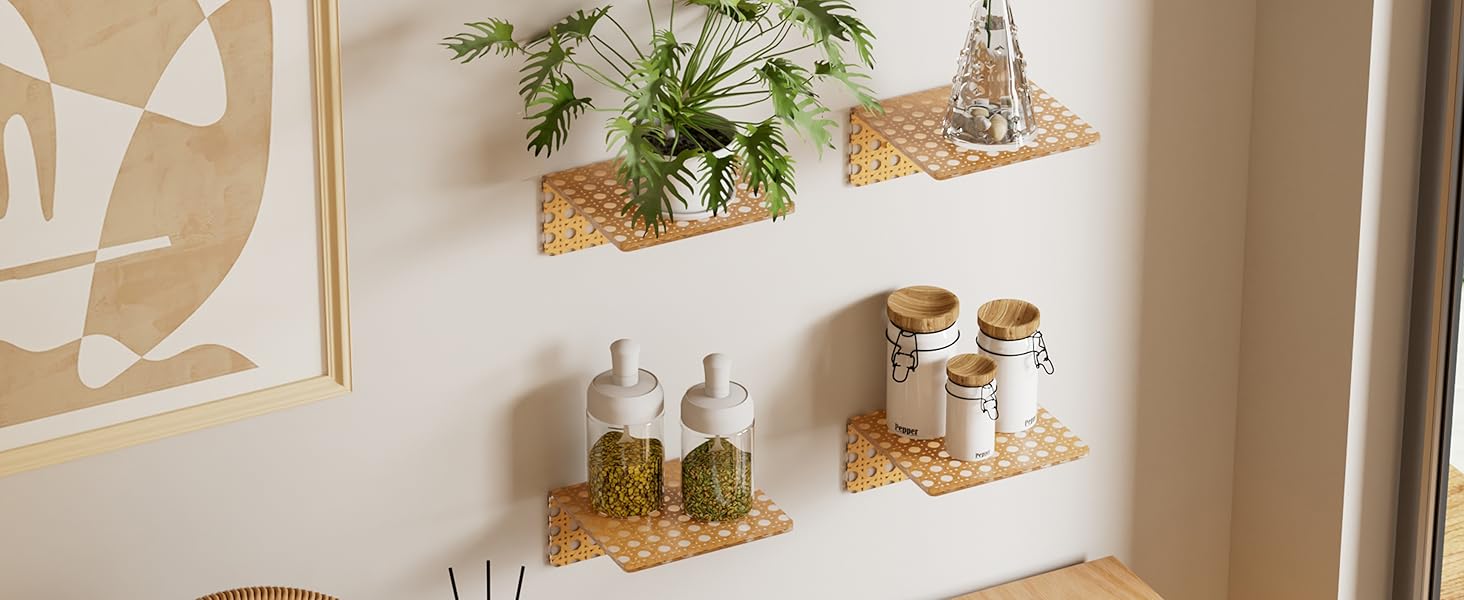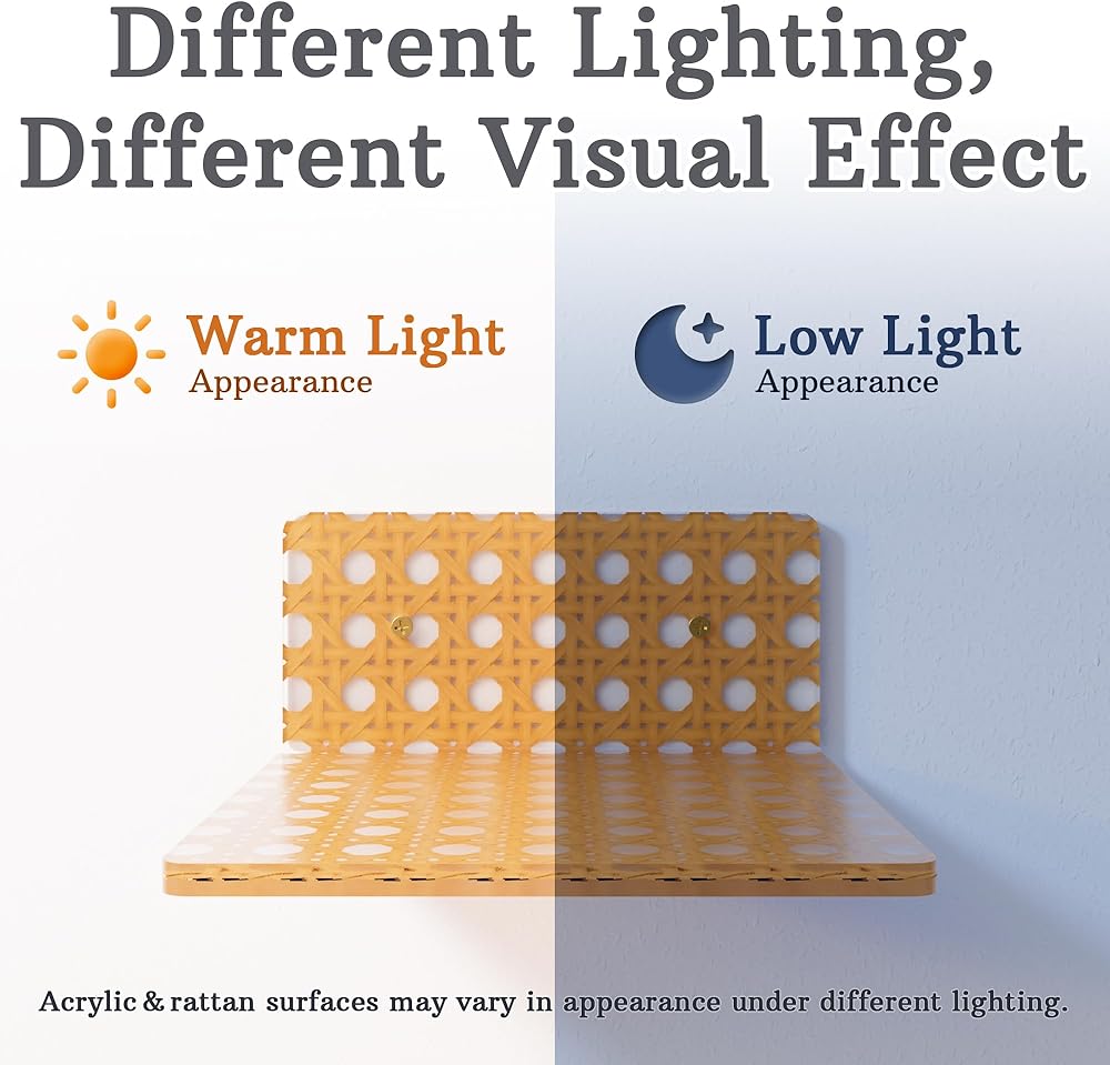 【Premium Acrylic with Embedded Rattan Design】 Made with layered acrylic and natural rattan embedded inside for enhanced durability and stain resistance. Unlike surface rattan, the sealed structure keeps the shelf clean and long-lasting. A durable rattan wall shelf and rattan floating shelves solution perfect for boho decor, boho wall decor and rattan wall decor lovers.