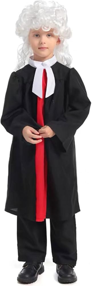 COMPLETE COSTUME SET: Includes black judicial robe, white collar piece, red tie, and matching white wig for authentic court appearance