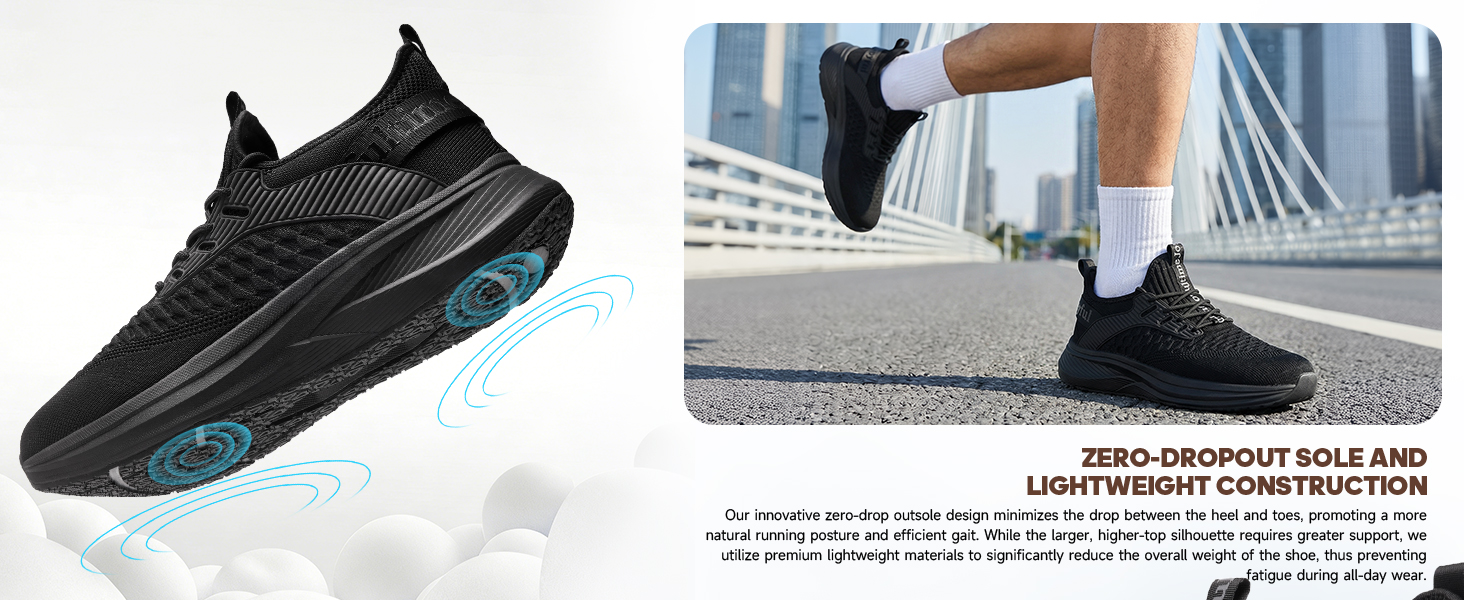 Zero-Drop Sole & Lightweight Construction: Our innovative zero-drop sole design minimizes the height difference between the heel and toe, promoting a more natural running posture and efficient gait. Despite the robust support needed for big and tall frames, we utilize premium lightweight materials to significantly reduce the overall weight of the shoe, preventing fatigue during all-day wear.