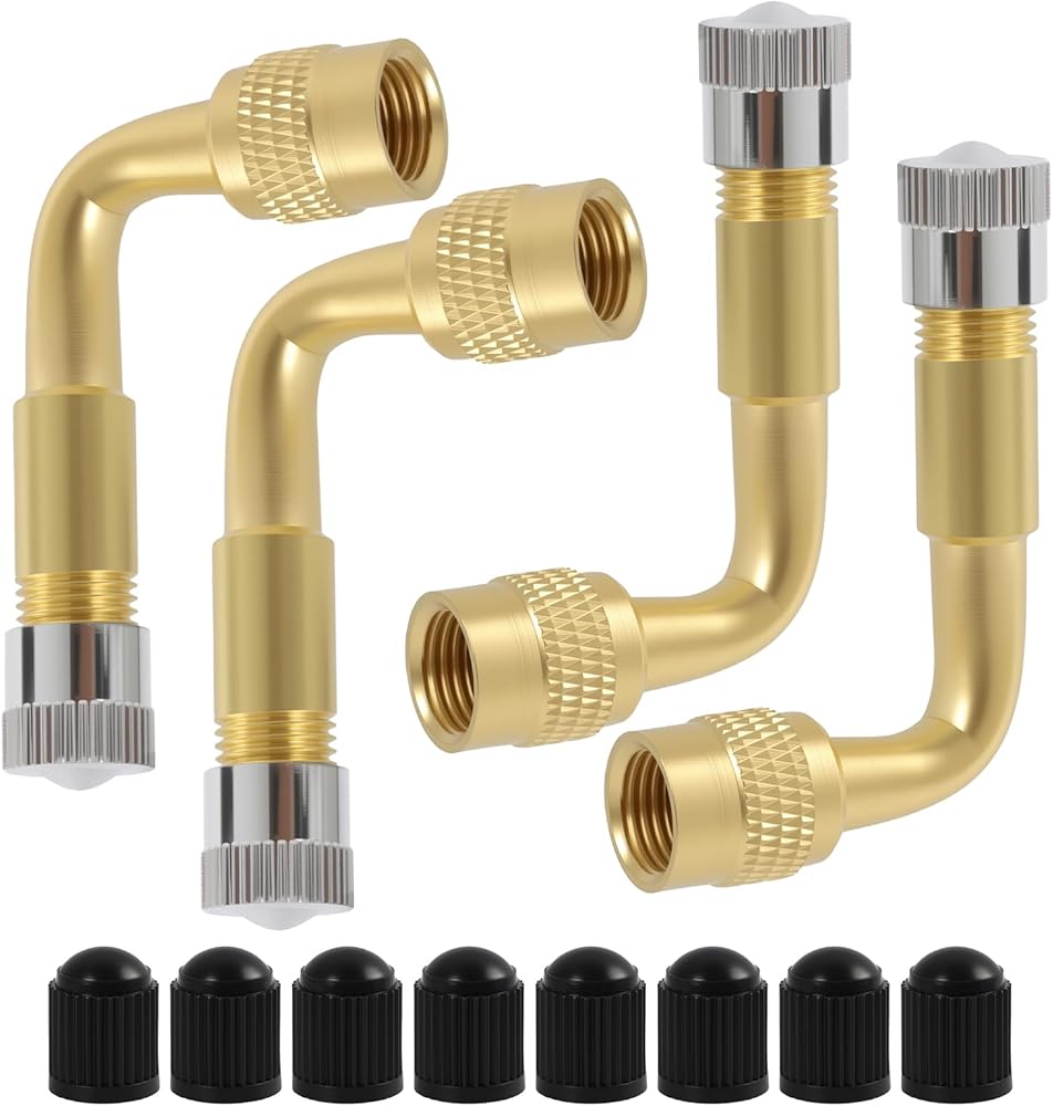 This four-piece valve extender kit revolutionizes tire maintenance with its innovative 90-degree right-angle design, solving the common problem of hard-to-reach valves on custom rims, dual-wheel configurations, and aerodynamic wheels. Precision-crafted from solid brass, these extenders are durable and ensure thread integrity even with repeated installations. The clever right-angle design easily avoids obstructions such as brake calipers, spokes, and deeply recessed rims. The freely rotating base allows for precise directional adjustments and fits virtually any wheel configuration, including passenger cars, trucks, SUVs, motorcycles, bicycles, RVs, trailers, and recreational vehicles. Installation is simple, requiring no adapters; simply screw it onto your existing valve and secure it with the integrated rubber seal and metal dust cap. This four-piece kit is ideal for RV and trailer owners (who often have difficulty accessing their inner dual tires) and car enthusiasts with modified wheels (where the valves are hidden inside the rim).