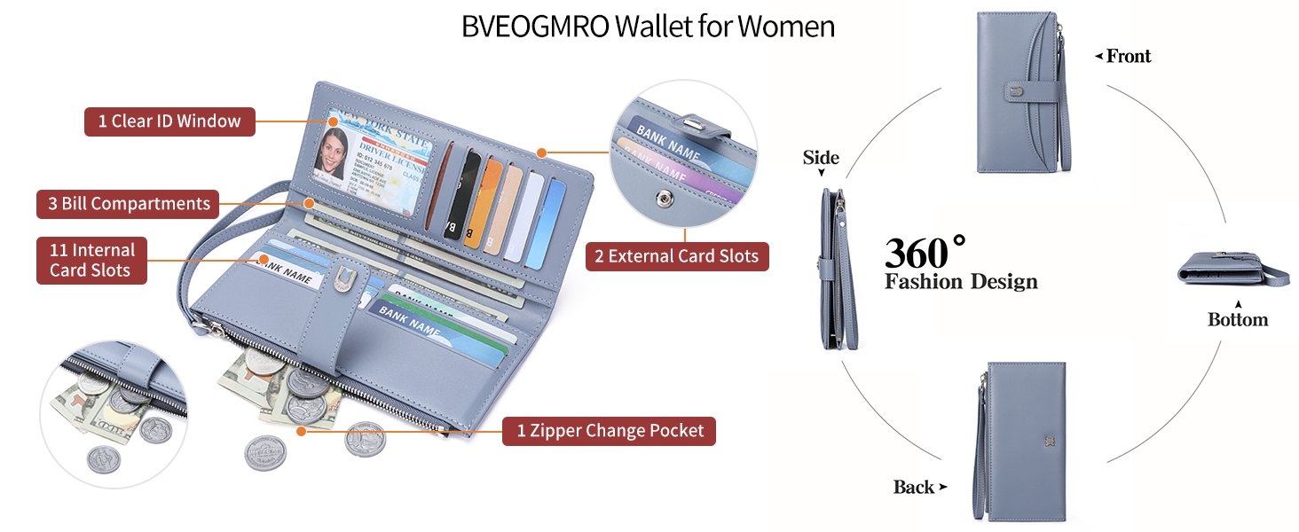 Large Capacity: Featuring 13 card slots (including 2 quick-access external slots), 1 clear ID window, 3 full-length bill compartments, and 1 secure zipper change pocket, this long wallet women keeps your cash, cards, and coins neatly organized and within easy reach