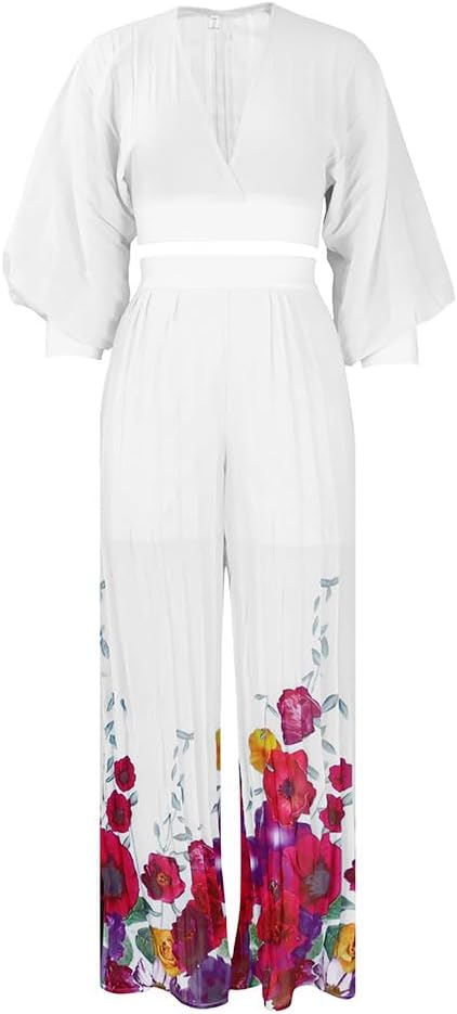 Temperament Chiffon V-Neck Pleated Top Printed Wide Leg Pants Set(White,XX-Large)
