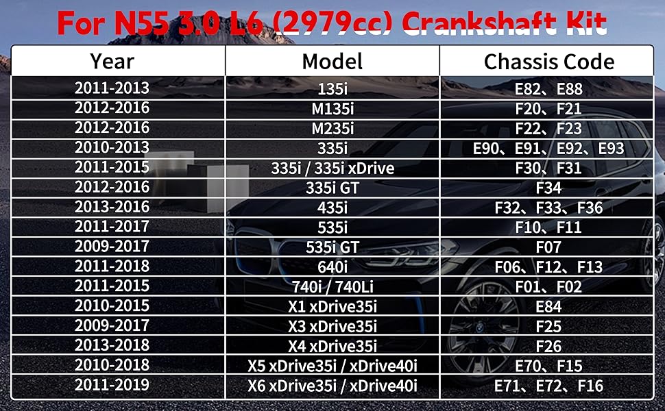 - OE: Crankshaft 11217580483 ,11212163665, Connecting: 11247624615, 11247586492, Main & Rod Bearing Kit: 11217580991, 11247576714, Piston & Ring: 11258619196, 11257610297, 11257610298 , 11257589824, 11257587914, 11 25 7 587 914, 11 25 8 619 196, 11 25 7 610 297, 11 25 7 610 298, 11 25 7 589 824