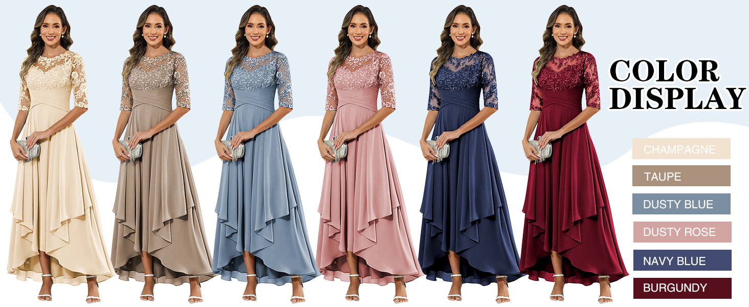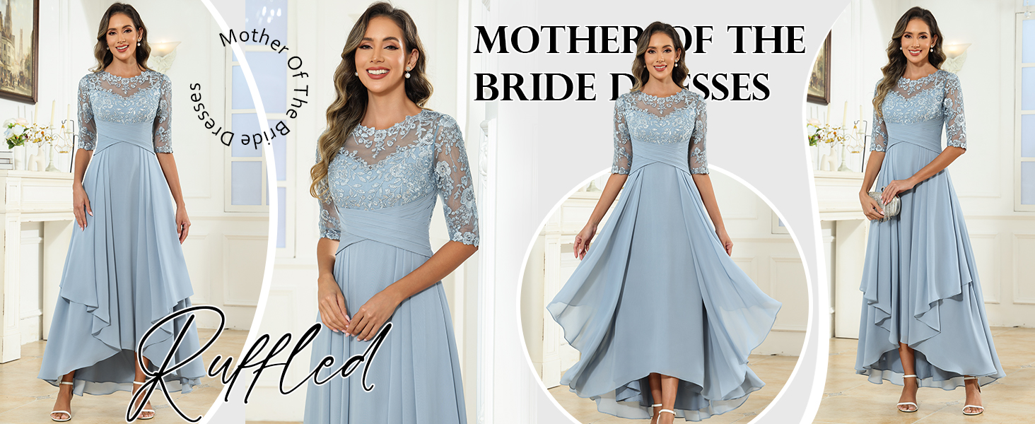 Features:This mother of bride dress is made of soft chiffon fabric,boat neck,sheer 1/2 sleeves,lace applique bodices,ruched pleated ruffle details,high low tea length floor long.It has a built-in bra,fully lined and zipper closure