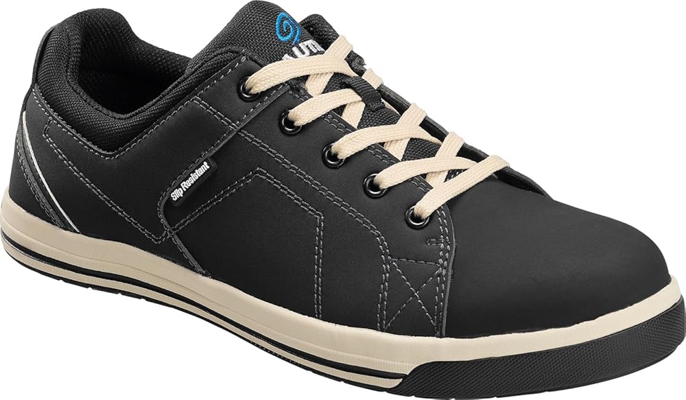 Look great and stay comfortable all workday long with the protective and supportive Nautilus N1420 ST work shoes. Designed with a more casual look, these work sneakers meet the needs of light industrial jobs and hospitality workplaces, providing all-day cushioning alongside electrical hazard protection, slip resistance, and compression protection with a durable steel toe. Style number: N1420 (Black). Premium Leather work shoes feature 100% metal-free, nondetactable hardware with no exposed metal to meet scratch-resistant requirements. Padded textile collar and tongue. Breathable textile lining for a comfortable fit. Durable heel cup prevents wear at the back. Removable Comfort Footbed provides long-lasting support and underfoot comfort. Cushioning EVA foam insole. Cushioned EVA midsole for added comfort and shock absorption. Slip-resistant rubber outsole with 0.54 Mark II slip rating. Rubber inserts in high-wear areas provide added traction and durability. Lightweight steel toe meets or exceeds ASTM F2413-17 I/75 C/75 impact and compression specifications and EH (Electrical Hazard) safety.