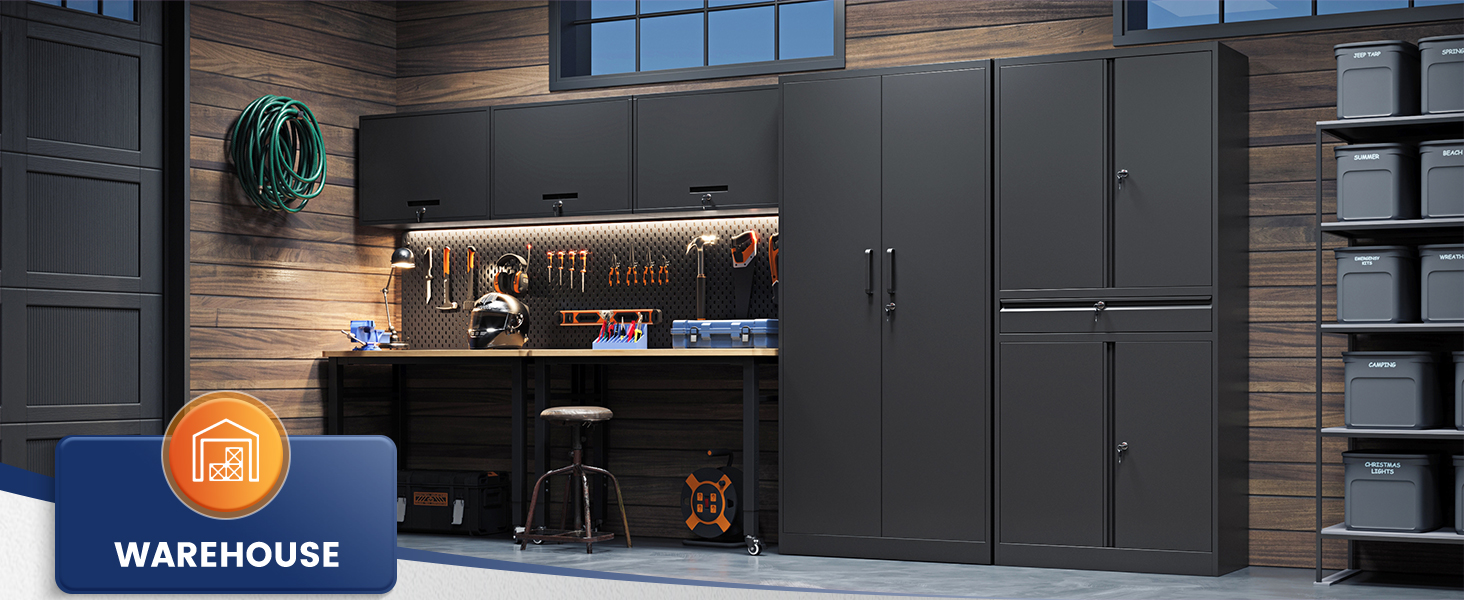 『HIGH QUALITY MATERIAL』:Whole-in-one reinforced heavy duty metal frame, load capacity up to 180lbs per shelf solid and strong.Environmental protection powder, scratch resistance and rust-resistance.Our metal storage cabinets are made of heavy gauge cold-rolled steel plate, sturdy and durable