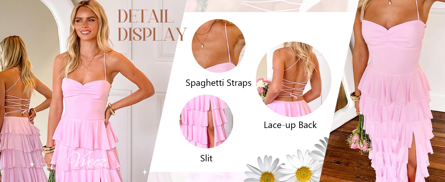 Eye-catching designs: Sweetheart,Chiffon,Tiered Ruffle,Spaghetti Straps,Sleeveless,Split,Floor Length,A Line,Ruched,Fully Lined,Built-in Bra in the Bodice,Back Strap.