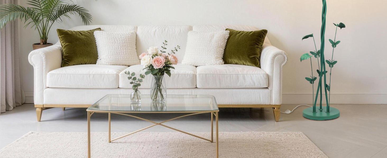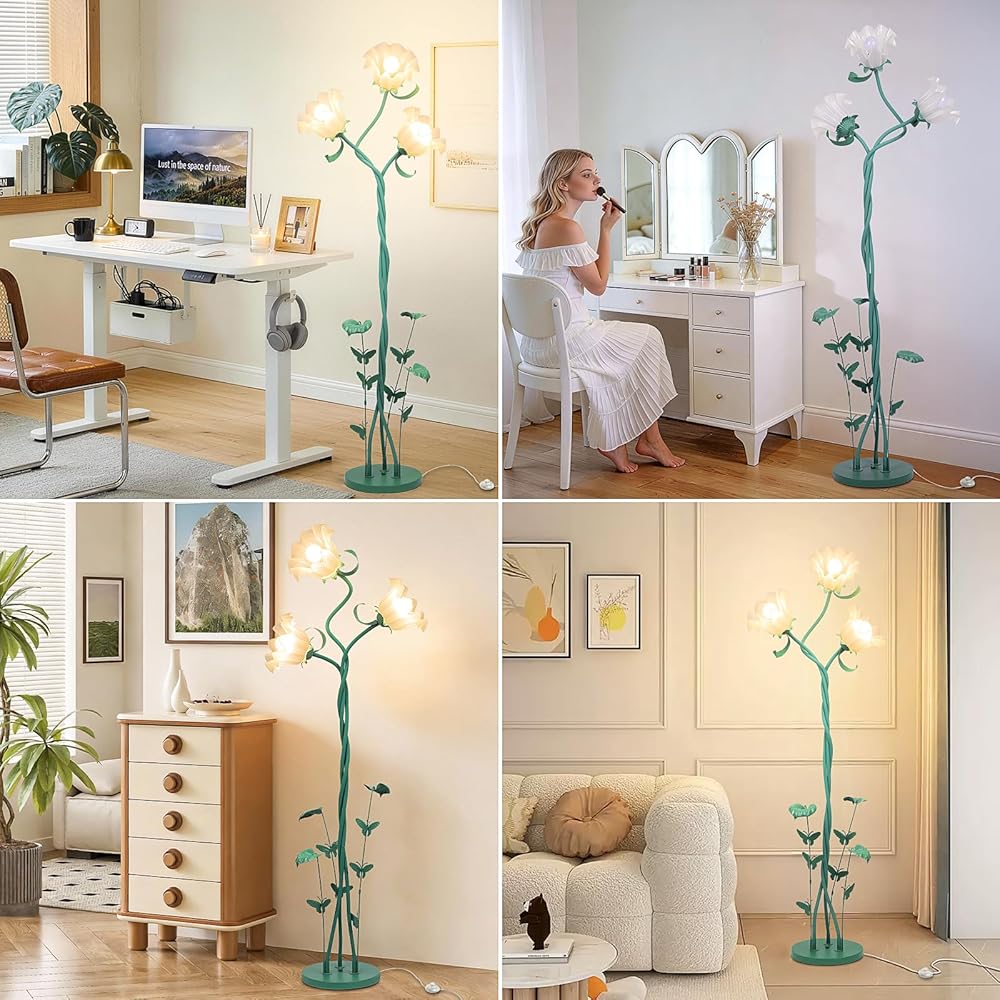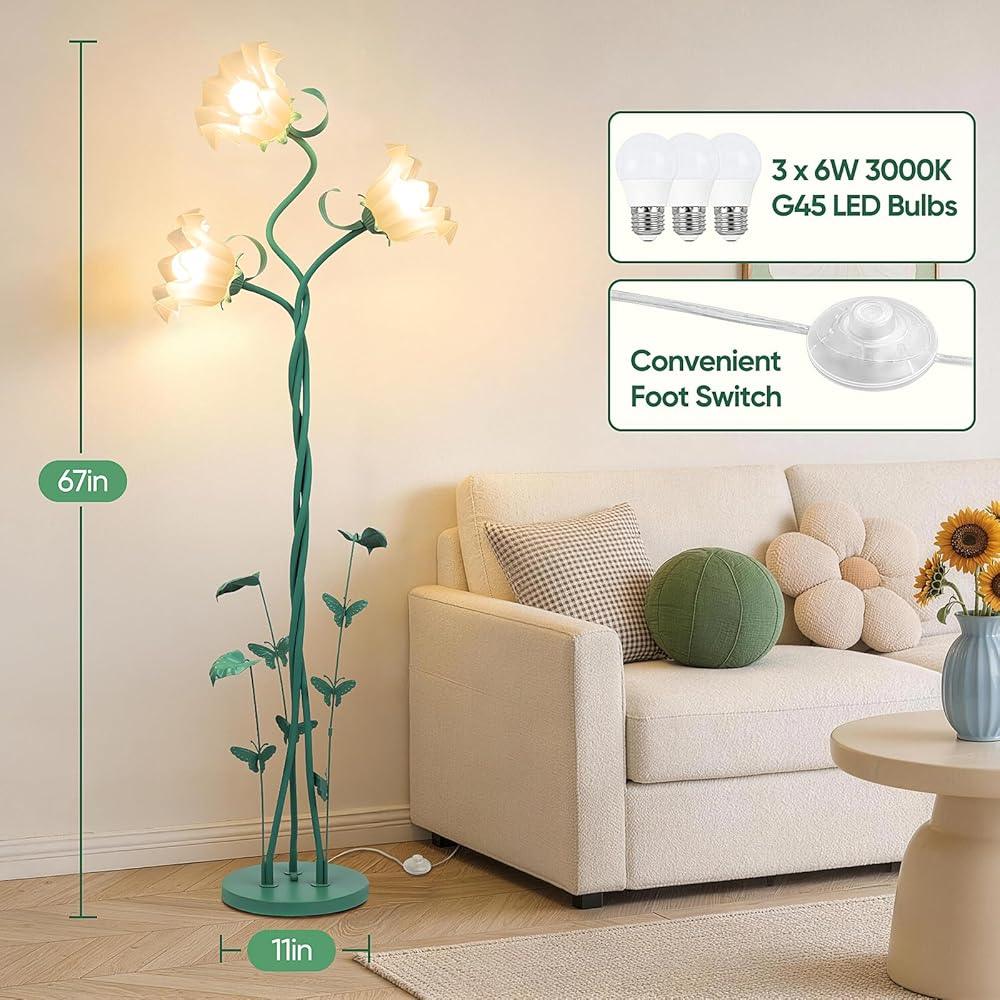 Vintage & Modern Green Floor Lamp: The unique lifelike leaves and butterflies at the base give this floral floor lamp its organic, tree-like elegance. Rising from the base, 3 green-painted poles intertwine into a single, dense vine - a living sculpture that provides unwavering support. When lit, warm 3000K light gently spills through its lily-of-the-valley inspired blossoms and green vine. Even unlit, its tree-inspired shape stands as a striking decor for boho, retro, farmhouse, modern spaces