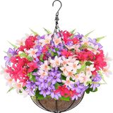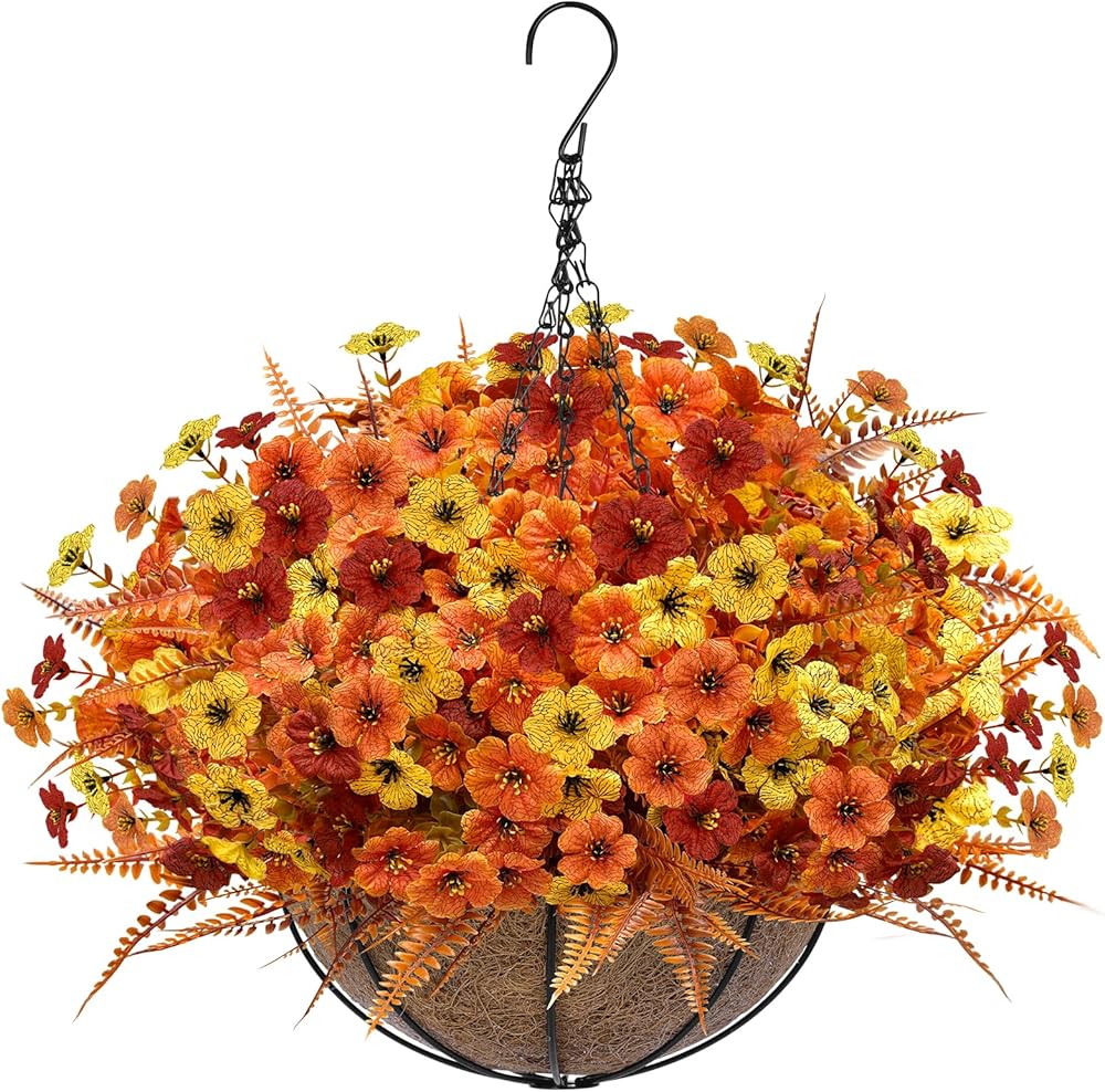 Easy Assembly: The uv resistant artificial outdoor flowers in hanging basket is handwoven from natural coconut liner. Simply place the grass net over the foam (semi-circular side up), insert stems through the net into the foam for stability, then put them in basket and hang it up; Or you can just arrange flowers in other planters