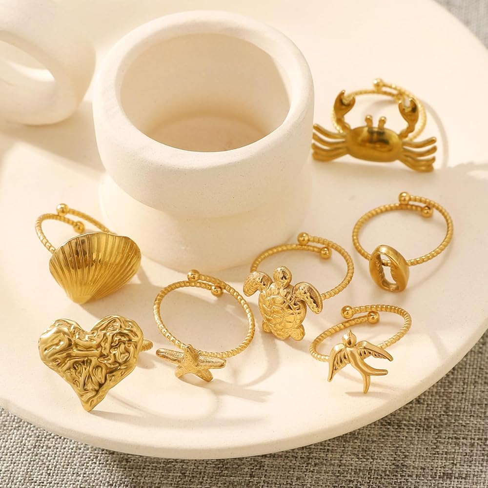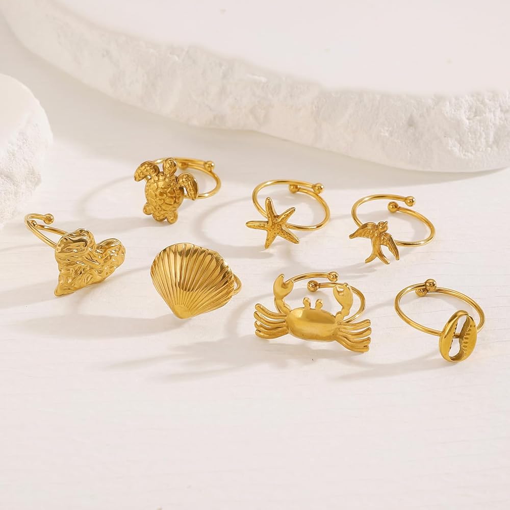 • 【Gold Starfish & Shell Ring Set】:This ring set embodies ocean romance, with the shell symbolizing the sea's gentle embrace and the starfish representing hope and luck. Perfect for nature and beach lovers, it adds a touch of freedom and vibrancy to your style