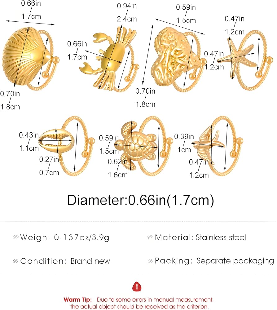 • 【7-Piece Gold Shell & Starfish Beachy Ring Set】:This set includes seven rings featuring a mix of delicate shells and charming starfish designs. Wear them together or separately for versatile styling that enhances any look