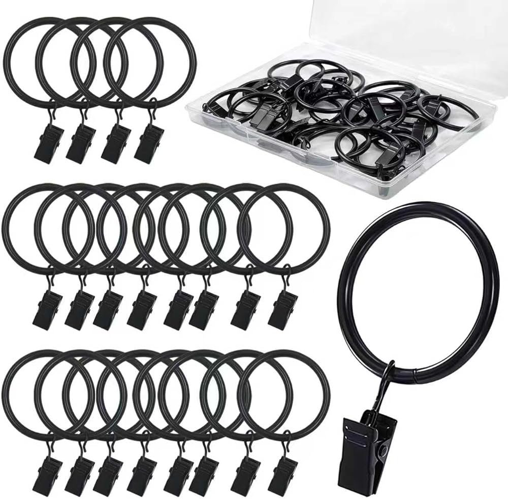 PACKAGE INCLUDES: Set of 20 black curtain rings with clips and a plastic storage box. The inner diameter of the eyelet is 1.5 inches, fitting curtain rod rings up to 1.2 inches or smaller. These curtain clips with rings are ideal for organized storage with the included box.
