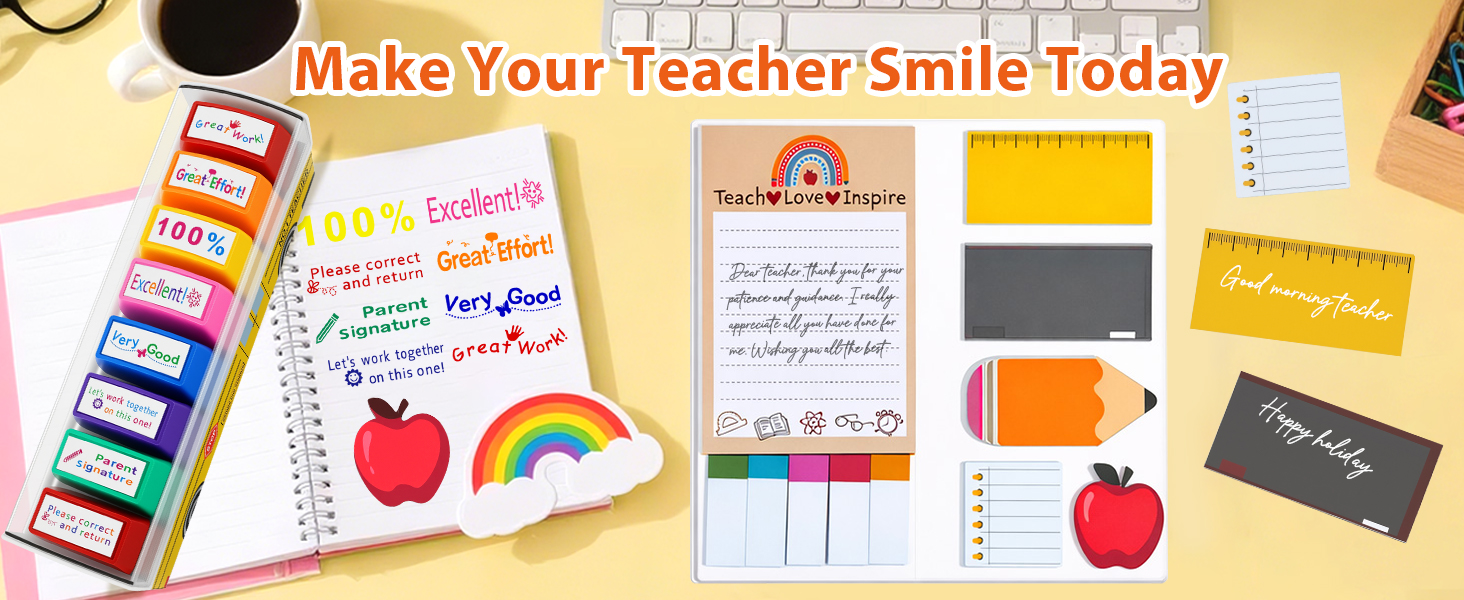 Valentines Day TEACHER APPRECIATION GIFT SET: Say "thank you" in the most thoughtful way! This all-in-one teacher gift box is packed with practical and inspiring goodies, including an 8-piece self-inking stamp set, a multi-pack of cute sticky notes, and a heartfelt bookmark. It's the perfect gift for Teacher Appreciation Week.