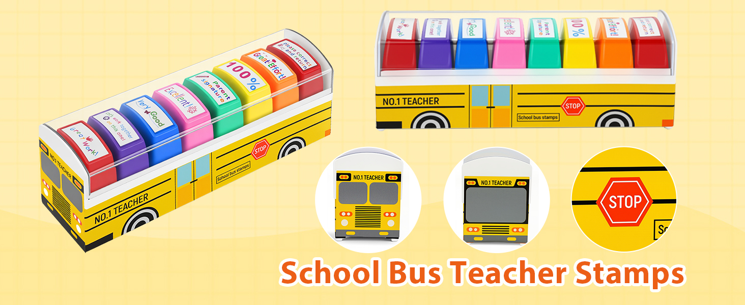SAVE TIME WITH 8 ESSENTIAL TEACHER STAMPS: Make grading faster and more fun! The self-inking stamp set covers every classroom need, from "Excellent!" and "Great Work!" to "Parent Signature." Housed in an adorable school bus case, it's a true classroom must-have for any elementary teacher.