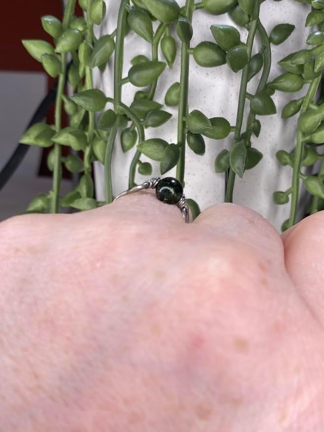 Tibetan Green Phantom Quartz 6mm Bead Ring in Stainless Steel- Silver-Bronze-Copper- Black Iron-Titanium-Niobium-14K Gold-14K Rose Gold Hand Hammered Ring Sizes 4-16