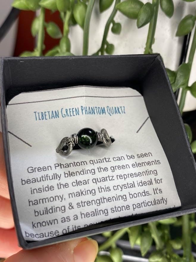 This is a beautiful hand-hammered and wire-wrapped ring with a 6mm Tibetan Green Phantom Quartz bead in the center. The bead is secure. *Note - You will receive a ring like the one pictured. As this is a production piece, each will be slightly different but finished to look just like the one in the picture. These rings are available in a variety of metals and can be ordered in sizes 4-16.