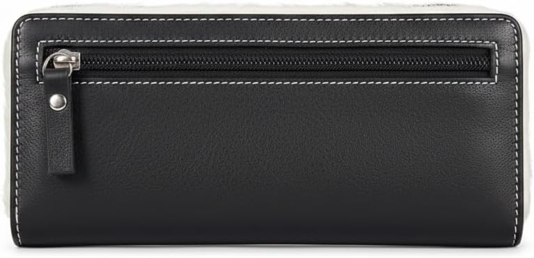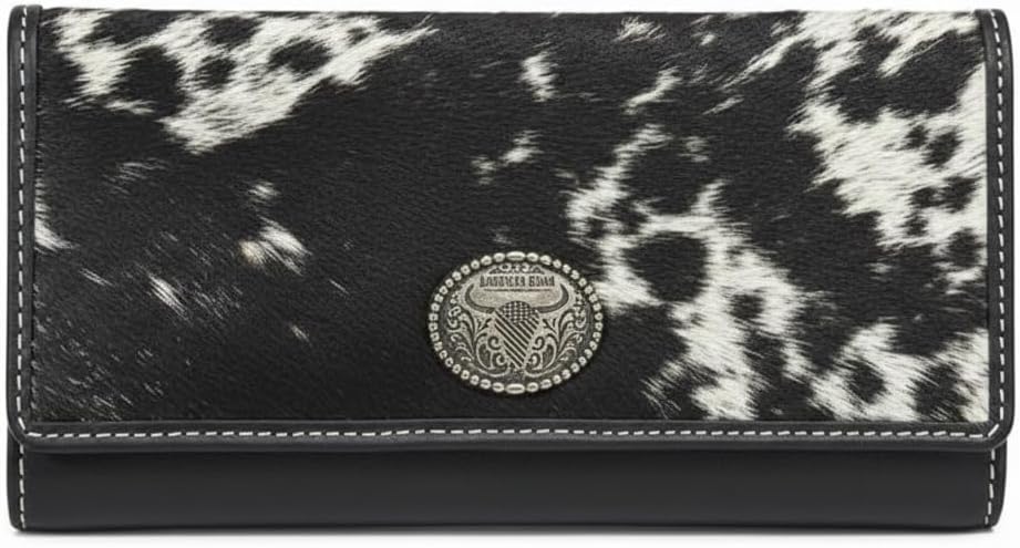 The Western Black Hair-On-Hide Leather Wallet for Women by American Bison combines bold texture with sleek sophistication. The flap is adorned with genuine black and natural hair-on-hide, creating striking visual contrast against the smooth black leather body. An oval American Bison metal plaque adds a polished signature detail, completing the refined Western-inspired design. Inside, the wallet is thoughtfully structured for everyday organization. The inside of the flap includes a clear ID window and five credit card slots for easy access. The accordion-style main compartment opens to reveal two spacious currency sections separated by a central zip pocket—ideal for coins or small essentials. With RFID blocking protection, this leather clutch wallet offers added security while maintaining classic Western appeal. Designed for daily use, travel, or special occasions, it provides functional storage in a sleek, modern silhouette. Please note: Due to the natural hair-on-hide and leather materials, variations in hair pattern, color tone, scars, or texture are normal. Each wallet is unique and reflects authentic craftsmanship. Perfect for: Western fashion enthusiasts Cowgirl accessories Everyday leather wallet users Gift for her 📌 Specifications Brand: American Bison Product Type: Women's Western Clutch Wallet Material: Genuine Leather with Hair-On-Hide Flap Color: Black with Natural Hair-On-Hide Security: RFID Blocking Interior Features: 5 Credit Card Slots 1 Clear ID Window 2 Bill Compartments 1 Central Zip Coin Pocket Dimensions: 7.5” W x 5” H x 1” D Country of Origin: India