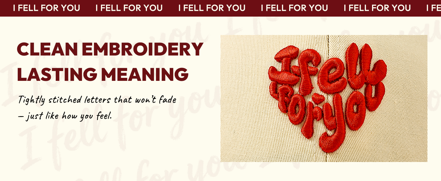 This charming baseball hat combines romance with everyday style. Exquisite 3D embroidery outlines a heart with the words "I Fell for You," making it a subtle yet sweet unisex statement.