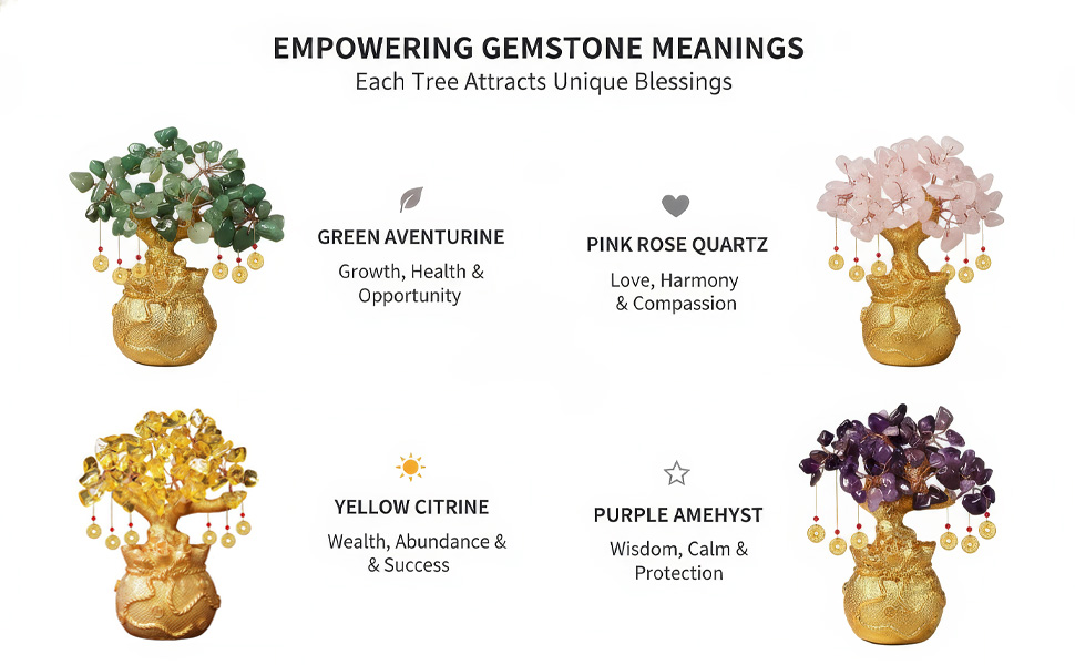 Symbol of Opportunity: Green Aventurine is known as the "Stone of Opportunity". In Feng Shui decor, this money tree invites wealth, luck, and success to your business or home.