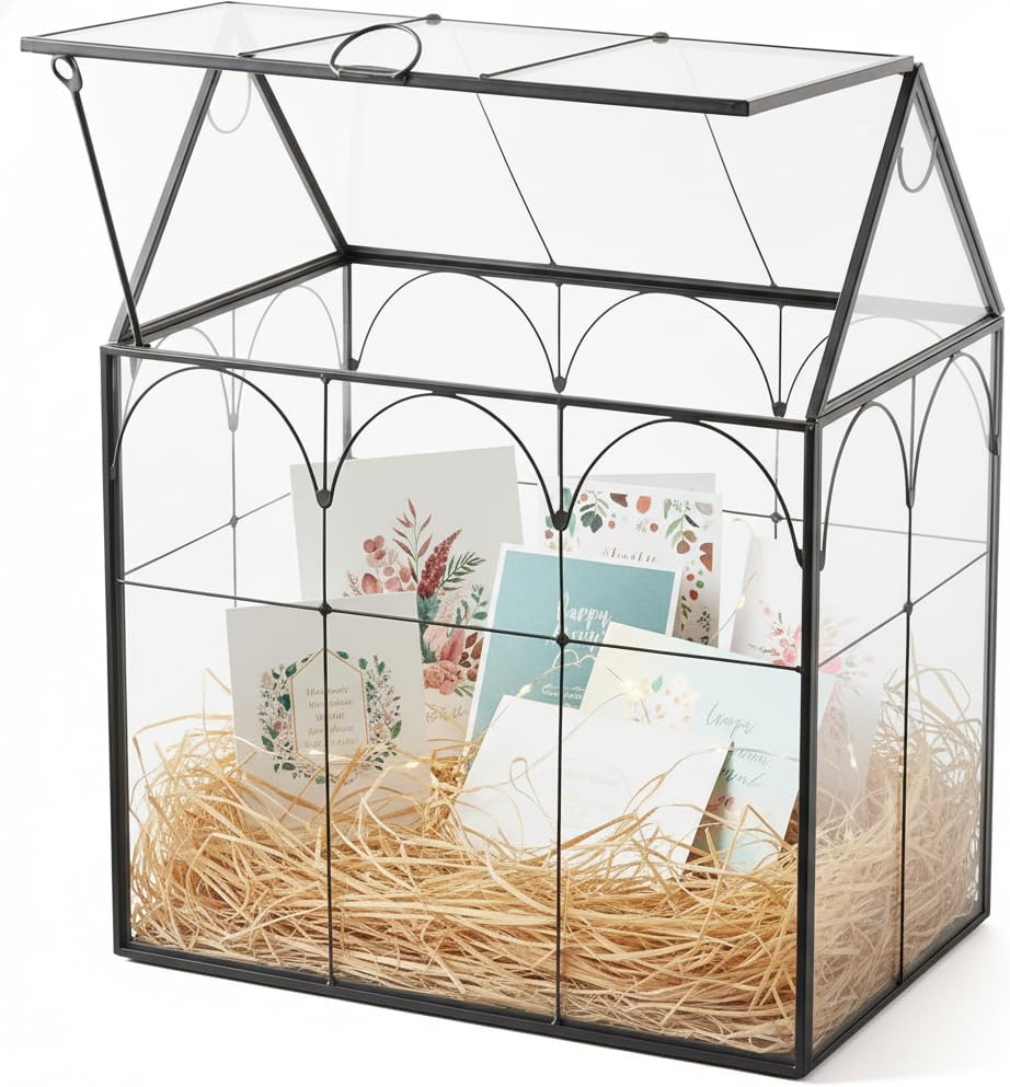 Versatile Wedding Card Box: Accompanying this terrarium is a stunning transparent gold card box, perfect for weddings, graduations, birthdays, and various special occasions. It securely holds greeting cards, cash and gifts while serving as a chic decorative piece to enhance your event's aesthetics