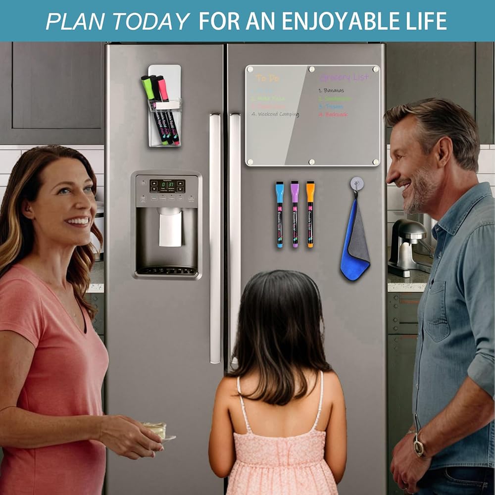 CLEAR MEMO BOARD FOR FRIDGE: The acrylic memo board for fridge is perfect for meal planning, to do / shopping / grocery lists, or daily reminders, providing a spacious layout to visualize your schedule at a glance.