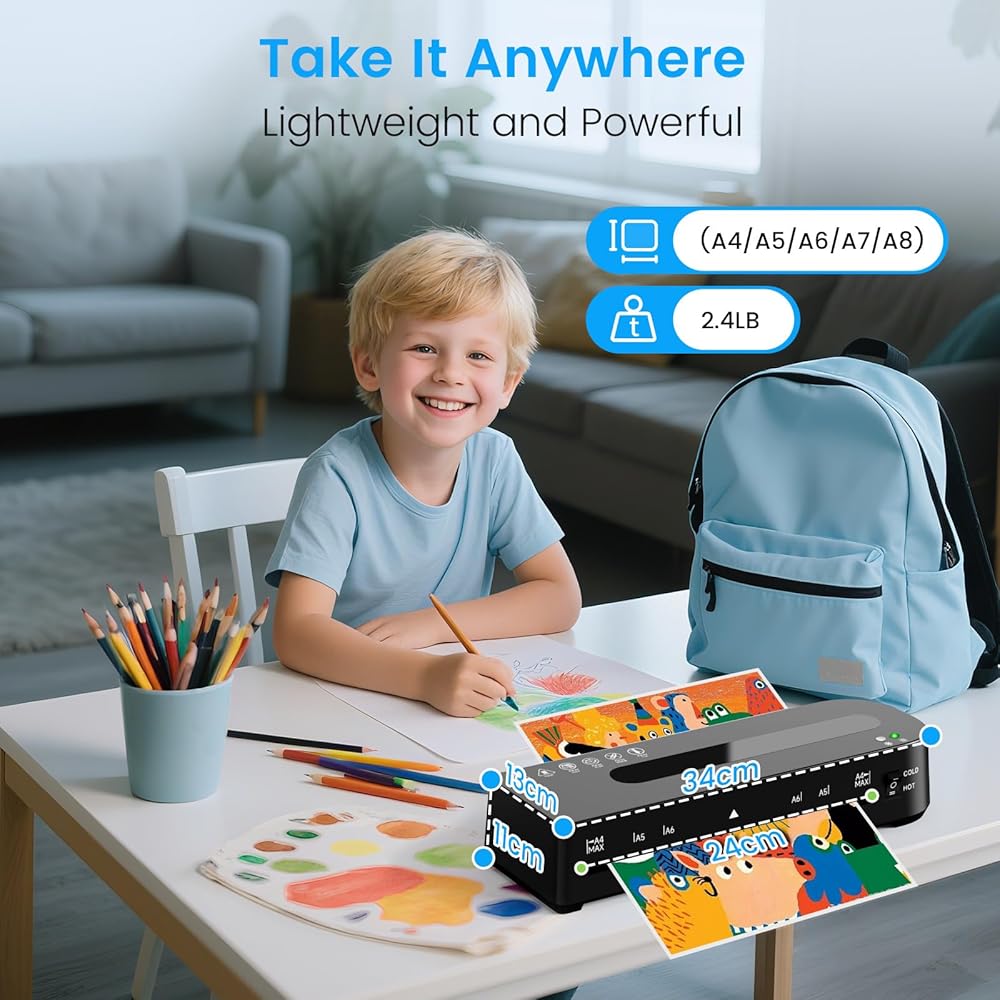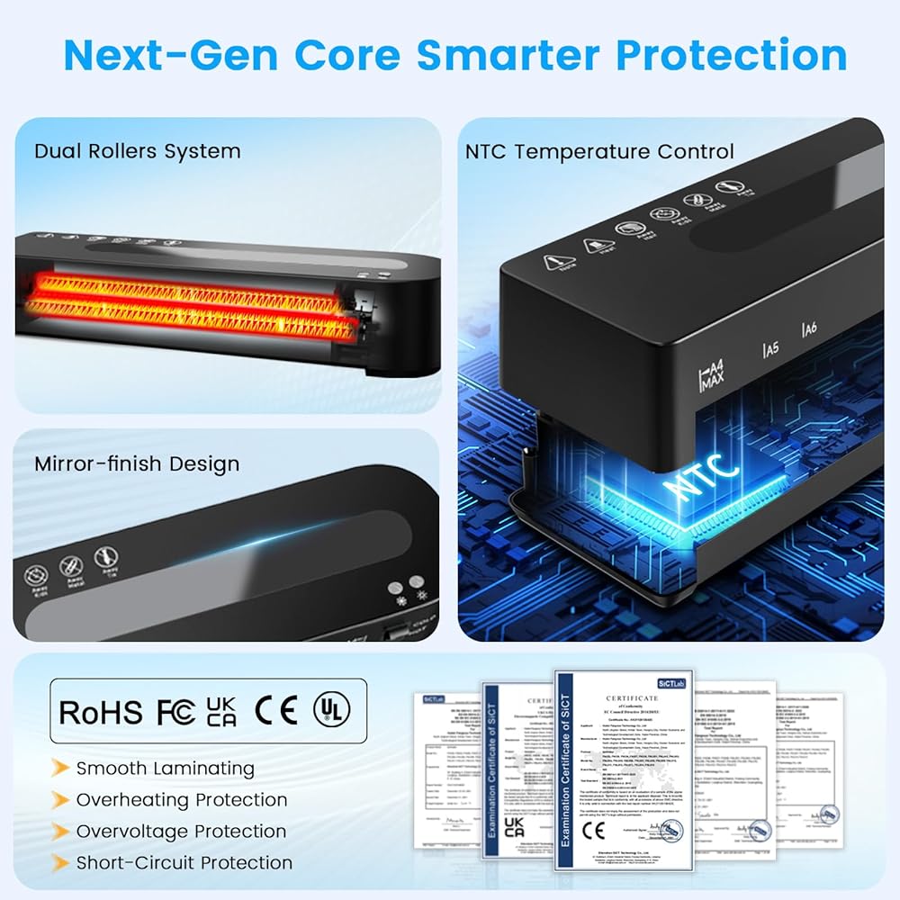 Dual Roller & Intelligent Protection: The patented dual roller system provides precise heat and pressure, ensuring high-quality lamination without bubbles, wrinkles, or curling. The NTC temperature control system prevents overheating, protecting your equipment more safely and extending the life of your A4 laminator.