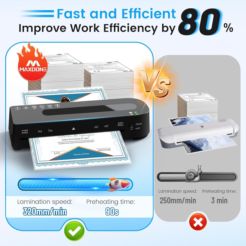 Quick Preheating and Laminating: This A4 laminator takes only 90 seconds to warm up and maintains a steady speed of 320 mm/min, providing professional lamination. It outperforms many models in the same price range. Ultra-quiet (30 dB), this laminator machine is perfect for home offices, classrooms, or busy workplaces.