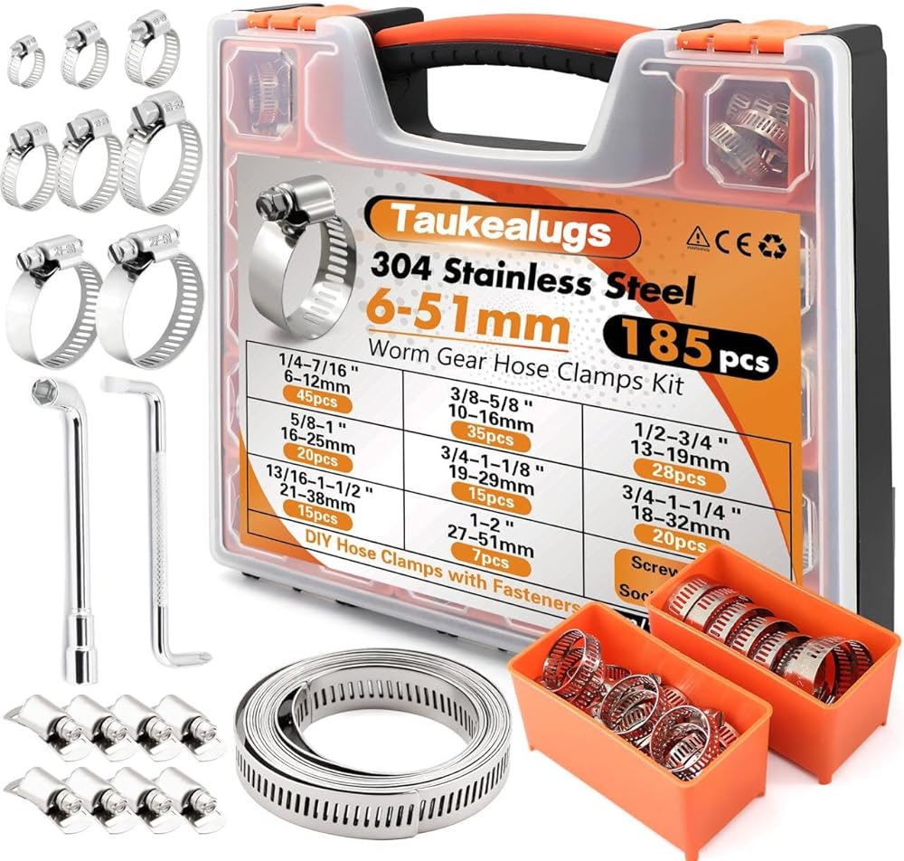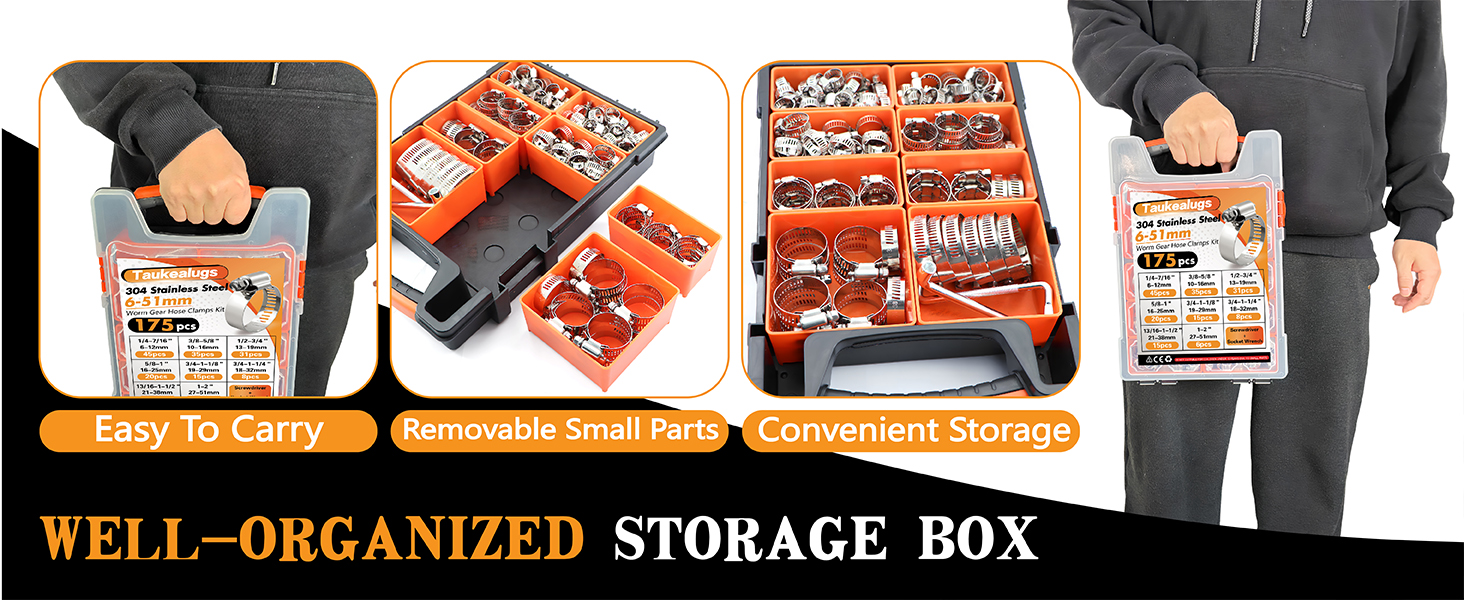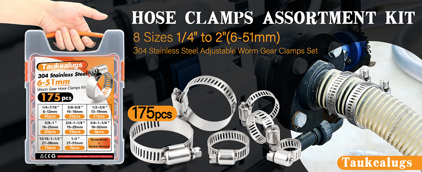 [One Kit for Every Job:175 Pcs of Durable 304 Stainless Steel]Our hefty 1/4”-2”(6-51mm) work range clamps set ensures you're always prepared. Every clamp is crafted from heavy-duty 304 stainless steel, guaranteeing a long-lasting, rust-resistant solution for any task, offering tremendous value