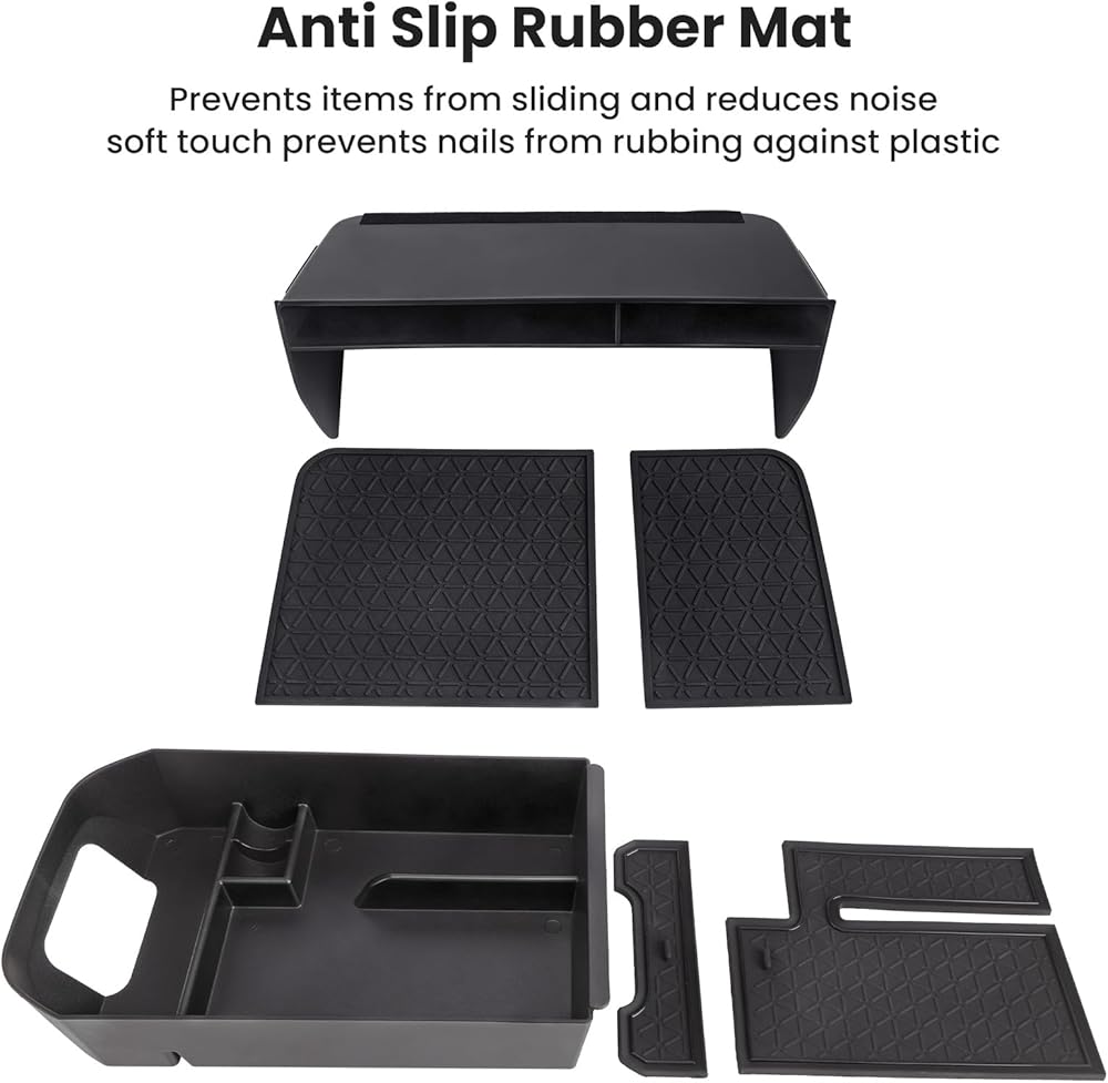 FEATURES: Comes with anti-slip rubber mats to prevent items from shaking and sliding while traveling; There is a hole in the tray for the charging cable to pass through.