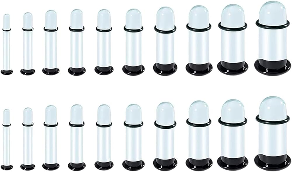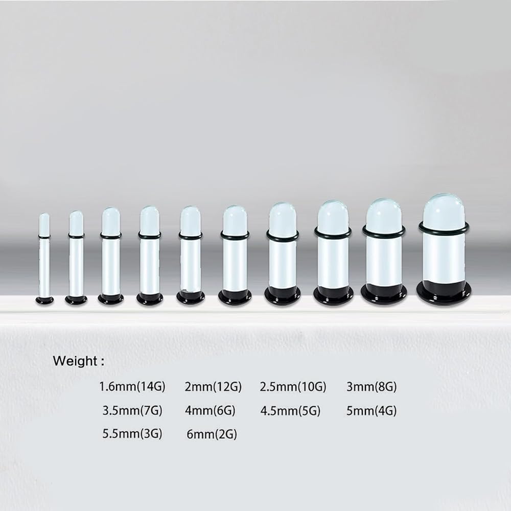 This glass ear stretching kit includes 10 pairs of single-flare plugs, ranging from the starting size of 1.6 mm to 6 mm. Each pair is secured with a silicone O‑ring for comfortable, gradual stretching.