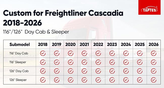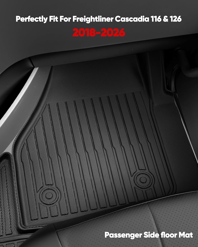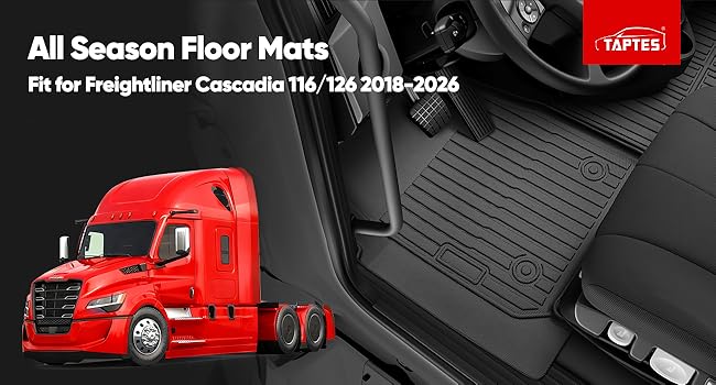 Custom Designed:TAPTES floor mats are custom-cut to fit for Freightliner Cascadia 116 & 126 Sleeper / Day Cab semi-truck 2018 2019 2020 2021 2022 2023 2024 2025 2026. Our floor mats match the truck without gaps, ensuring a secure and precise fit. They are compatible with automatic transmission but will not fit vehicles equipped with custom passenger seat bases