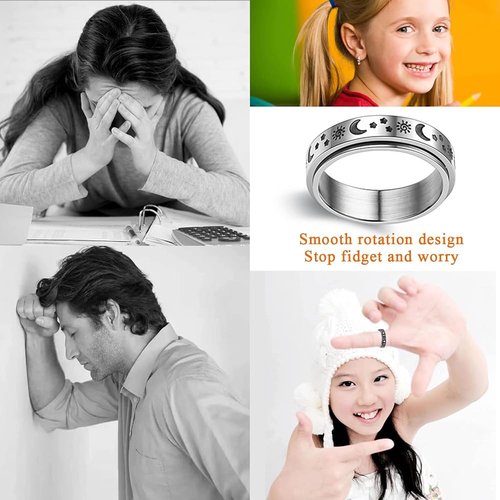 ✔️[Eases Anxiety] This spinning fidget ring has flexible rotation. The moon and star spinner band can help you relax when you're feeling nervous. You will become more concentrated while studying or thinking as a result of wearing this anxiety band.