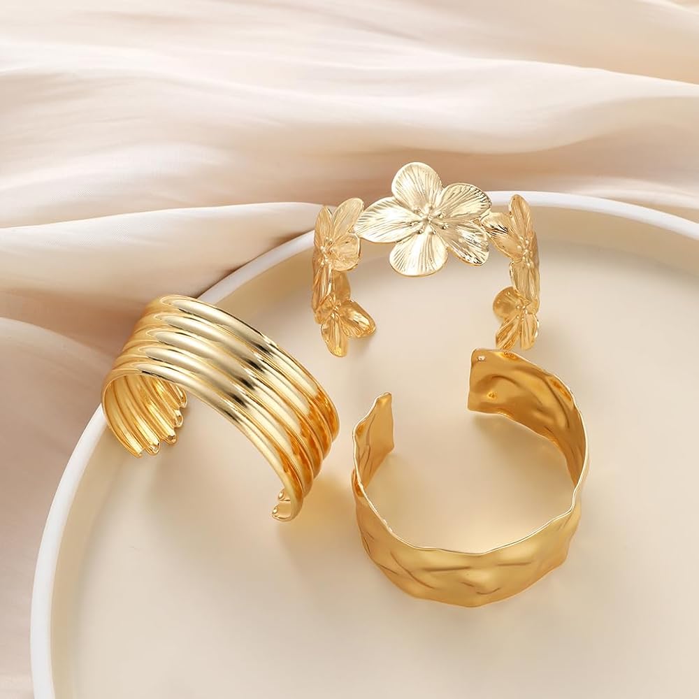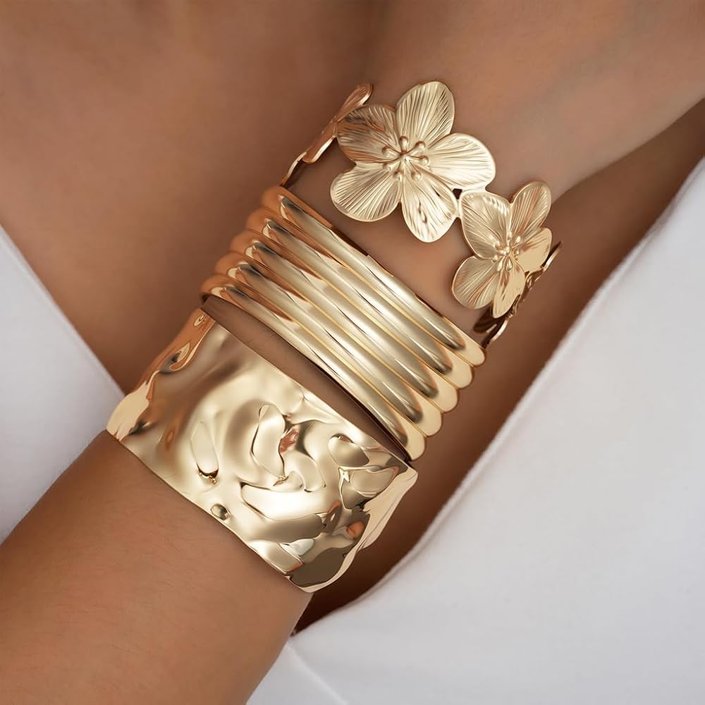 Unique Design: Make a statement with this chunky gold flower bangle bracelets set, featuring vintage wide stackable designs and large floral cuff details for a punk-inspired look. This pack blends bold floral shapes with edgy wide bands, giving you a standout wrist accessory that's for layering or wearing solo
