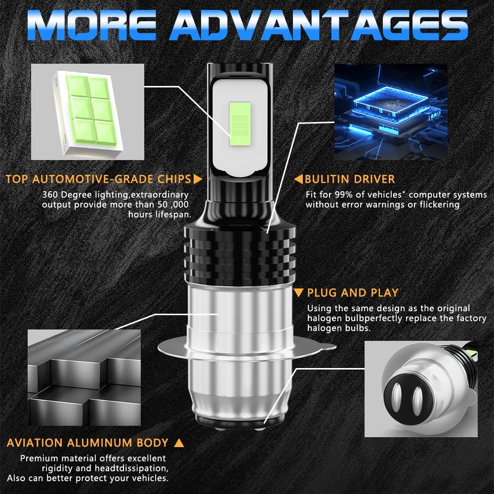 Plug and Play:H6M ice blue bulbs are Silent Fanless, H6 high/low beam bulbs body material is space aluminum alloy, good durability fast heat dissipation.H6M bulbs are fit for 98% motorcycles / ATV / UTV, non-destructive installation, plug and play, H6 bulbs can be turned on quickly in 0.01 seconds, saving warm-up time.
