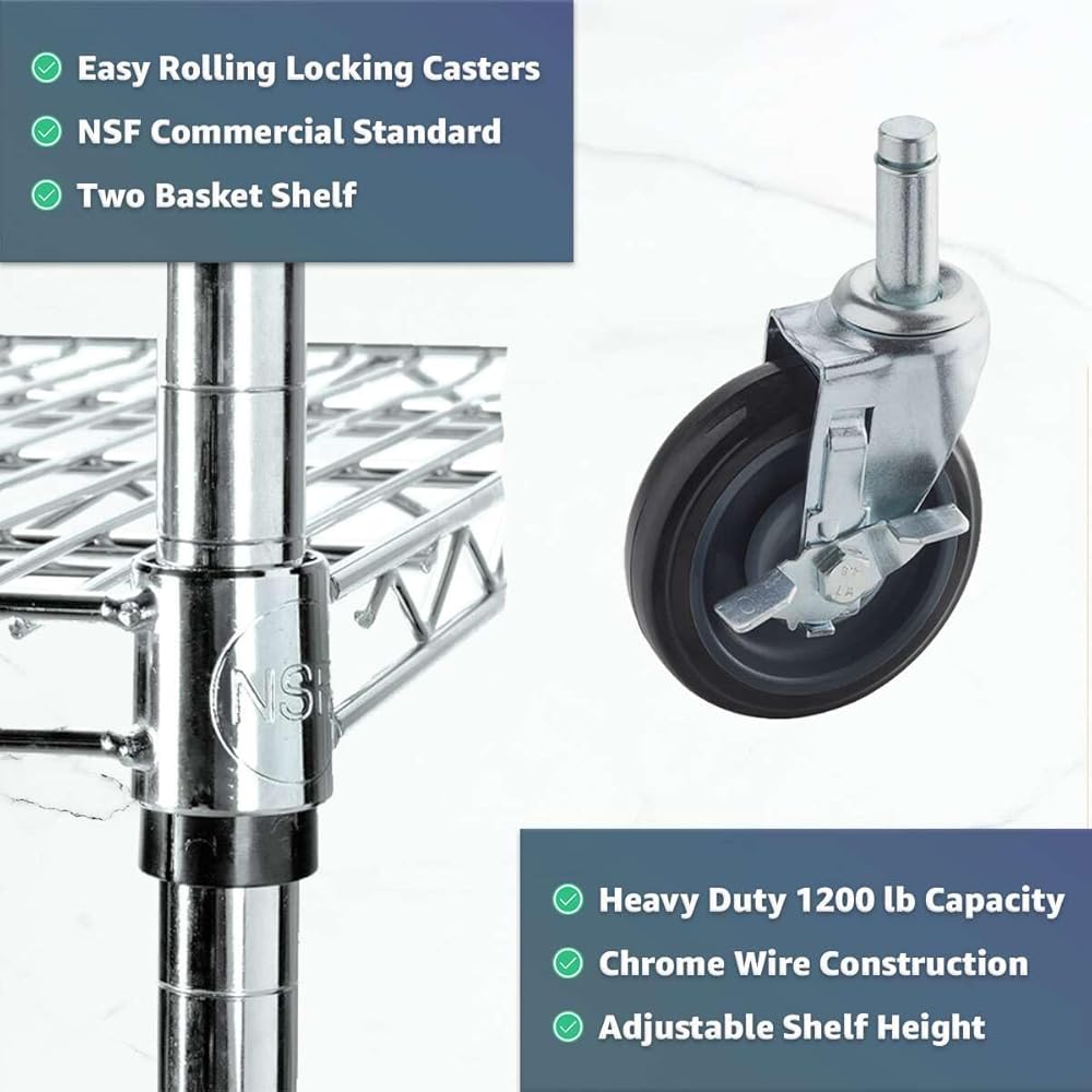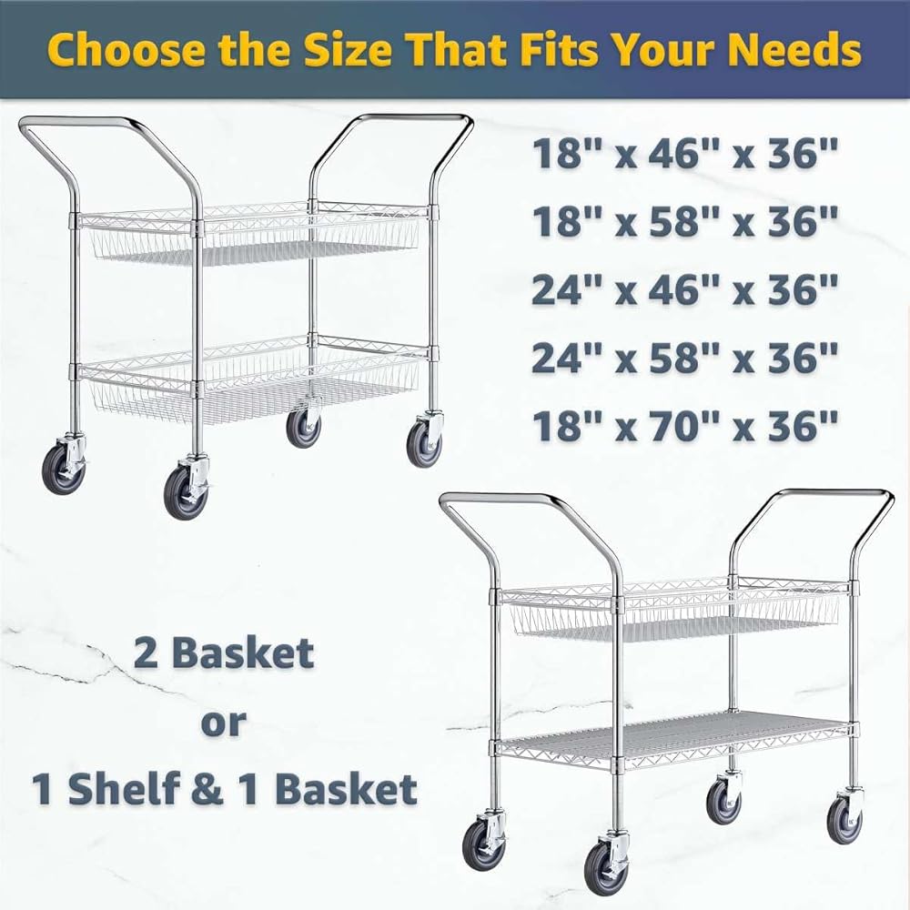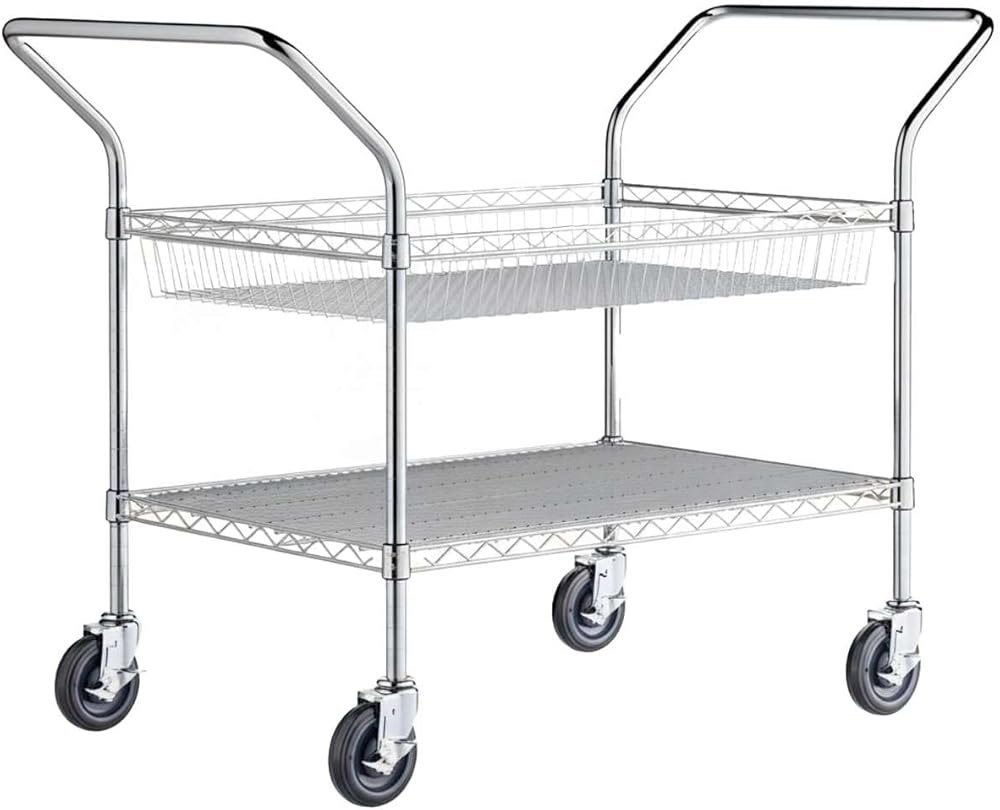 This 24" x 58" x 36" chrome one shelf and one basket utility cart offers strength, mobility, and versatility for professional use. Built with durable chrome-plated wire, it is suitable for dry environments such as offices, warehouses, retail stores, and kitchens.