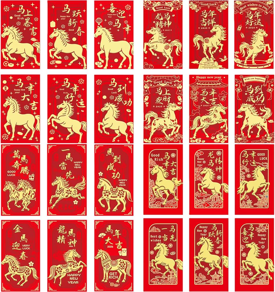 Lunar New Year Decorations: The 2026 red envelopes for lucky money are made of high quality and durable materials. The shiny gold foil and exquisite embossing with a gold relief pattern design are essential Chinese New Year decorations or gift 2026, including 24 different blessings and horse patterns.