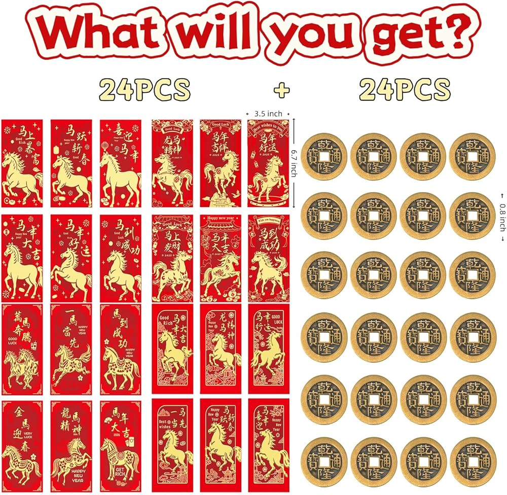 Package Includes: You will get 24 pieces Chinese New Year red envelopes in 24 unique patterns, each with a size of about 3.5 x 6.7 In; You will also get 24 pieces Chinese antique copper coins with a diameter of about 0.8 inch. Perfect for Chinese New Year 2026, weddings, birthday parties, family visits, and other festive events.