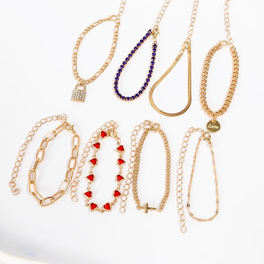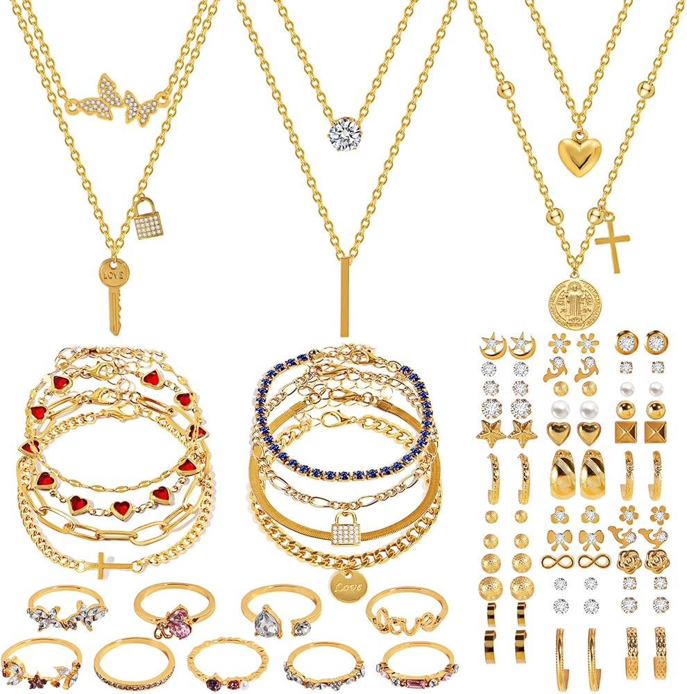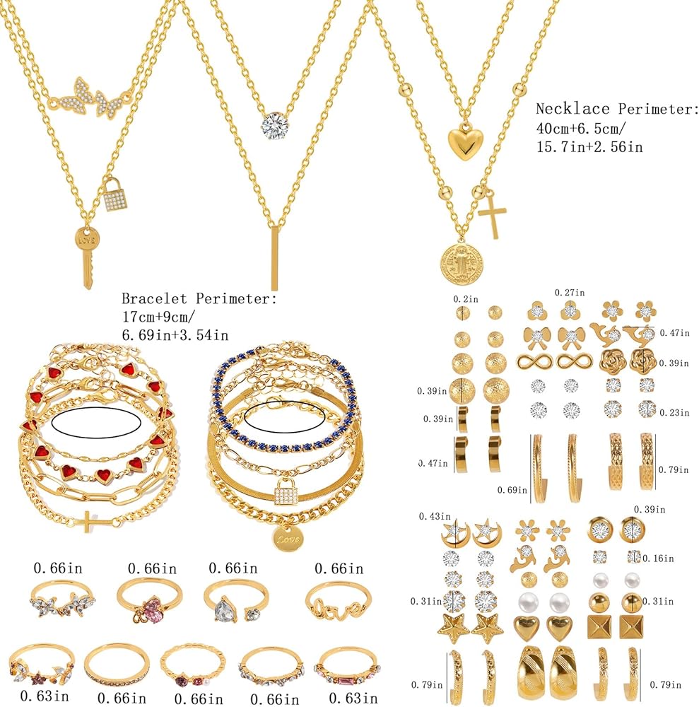 Elevate your jewelry collection with this stunning gold-plated fashion set featuring an array of versatile pieces. The set includes three layered necklaces adorned with eye-catching butterfly crystal pendants and delicate heart charms, perfect for creating a sophisticated layered look. The matching bracelet collection showcases charming heart details and varied chain designs that add a touch of romance to any outfit. An incredible selection of 36 pairs of stud earrings completes this set, offering multiple styling options from classic crystals to pearls, geometric shapes, and decorative motifs. Each piece is crafted with attention to detail, featuring secure clasps and comfortable fits. The gold-plated finish provides a luxurious look while remaining lightweight and comfortable for everyday wear. Whether dressed up for special occasions or styled casually, this comprehensive jewelry set offers endless possibilities to mix and match according to your mood and outfit. Perfect for gifting or treating yourself to a complete jewelry wardrobe refresh.
